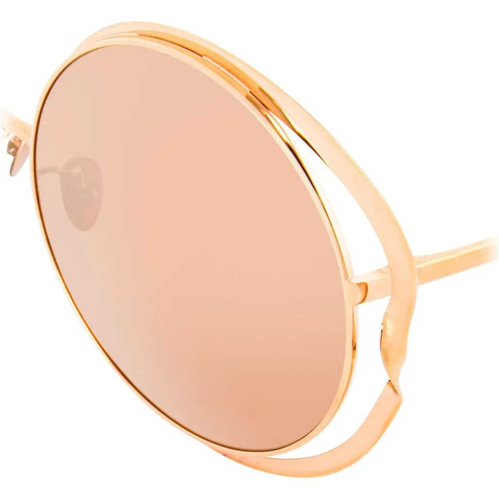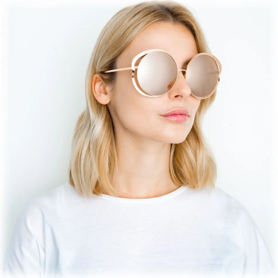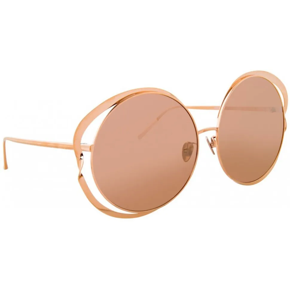 Key to the Linda Farrow collection, these oversized round ‘Aimee’ Linda Farrow sunglasses will instantly make a glamorous statement. Crafted entirely from 18 – 22 carat rose gold-plated titanium, these special sunglasses feature rose gold precious lenses with a delicate twisted ribbon which creates a hyper feminine silhouette that mirrors the frames and showcases superior craftsmanship.