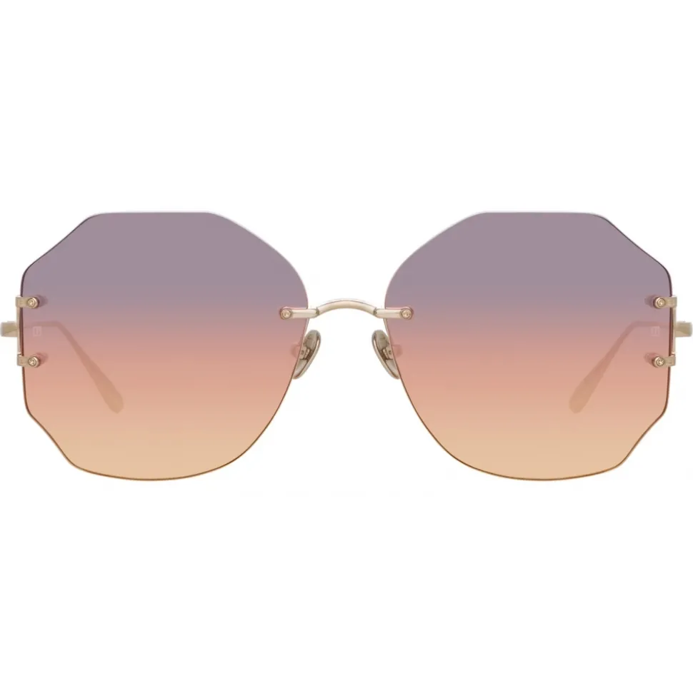 LINDA FARROW’s Lisette sunglasses cast a playful oversized silhouette. The butterfly shape is formed from 3mm thick lenses expertly cut and hand polished for the glossiest of edges. The rimless sunset gradient lenses are clasped in place with an elegant setting which folds over the outer edge.