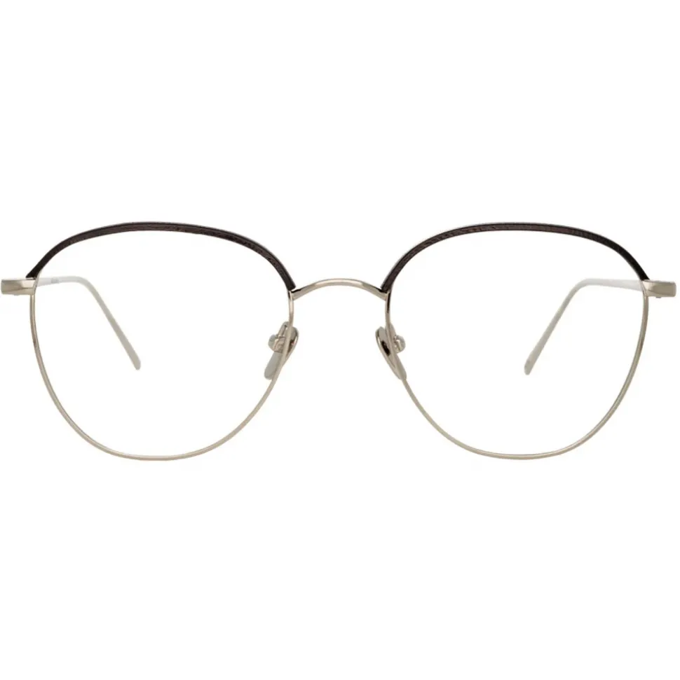 Plated with white gold, these square men’s Linda Farrow optical glasses pair a pop of rich texture with a streamlined silhouette. The black leather half Windsor rim to the top of the frame creates a rich contrast to its refined aesthetic, inspired by the textures and colours of the souks of Morocco.