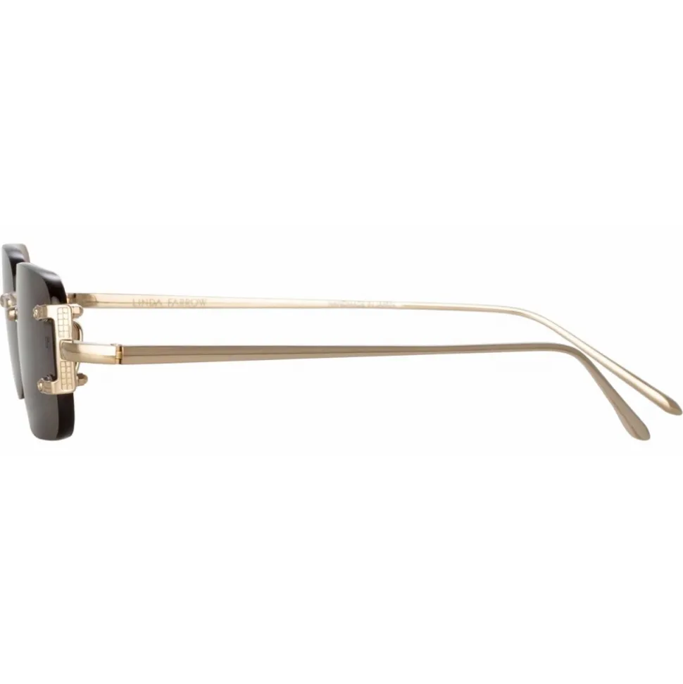 The Taylor sunglasses from the LINDA FARROW collection require a closer look. The solid grey rectangular lenses in this rimless silhouette are 3mm thick bringing added substance to the frame’s slim proportions. The glossy edged lens is clasped in place with and intricate temple setting which folds neatly along the outer edge. Engineered from 22 carat yellow gold plated titanium with contrasting white gold etching, the end piece transitions seamlessly into our signature tapered temple. The faceted nose bridge is engraved our logo and finished with adjustable nose pads for a comfortable fit.