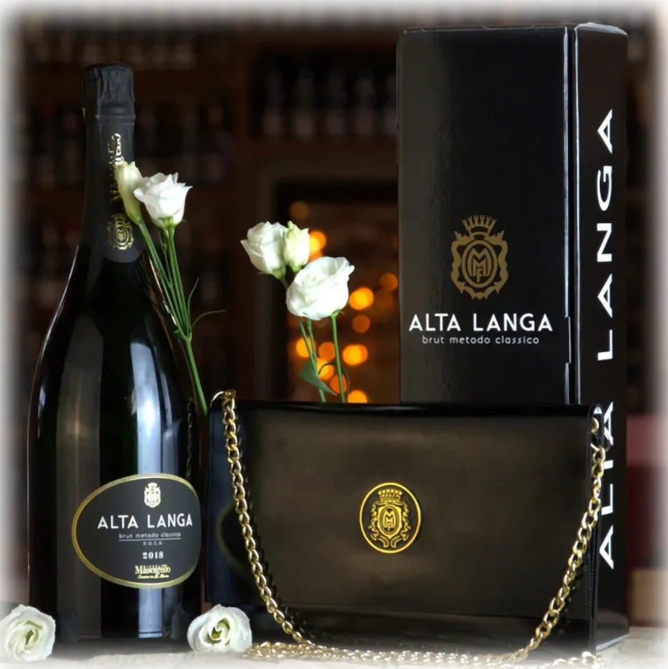 12 bottles of Alta Langa Spumante D.O.C.G. Brut Millesimato 2019 wine. The offer is accompanied by a black calfskin bag with a gold chain personalized with the historic logo of the Cantina Storica Mascarello Michele & Figli. C. Valletti S.n.c