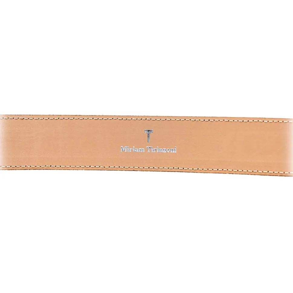 Black python leather belt with a silver buckle featuring the Miriam Tirinzoni logo. The size is adjustable, with clips, and it has a height of 40 mm.