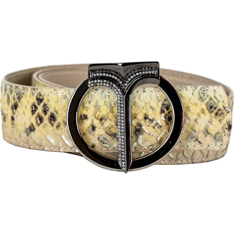 Calf leather belt with a python print in shades of yellow, featuring a silver logo buckle embellished with Swarovski crystals.
