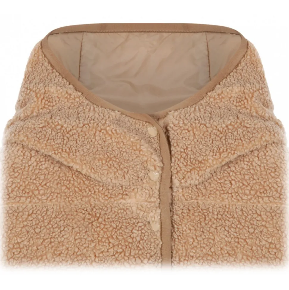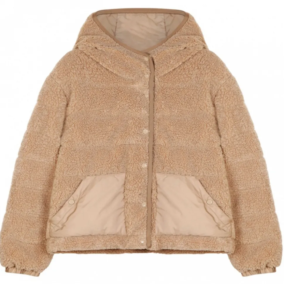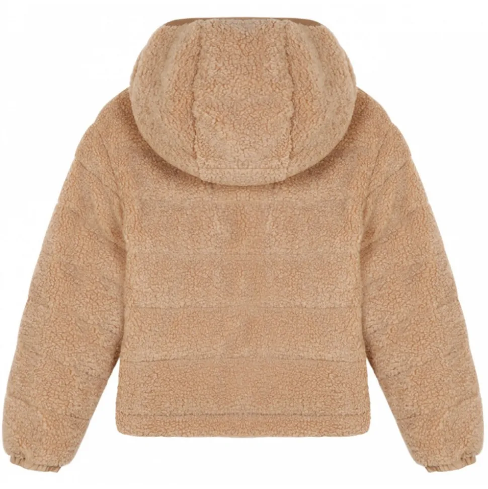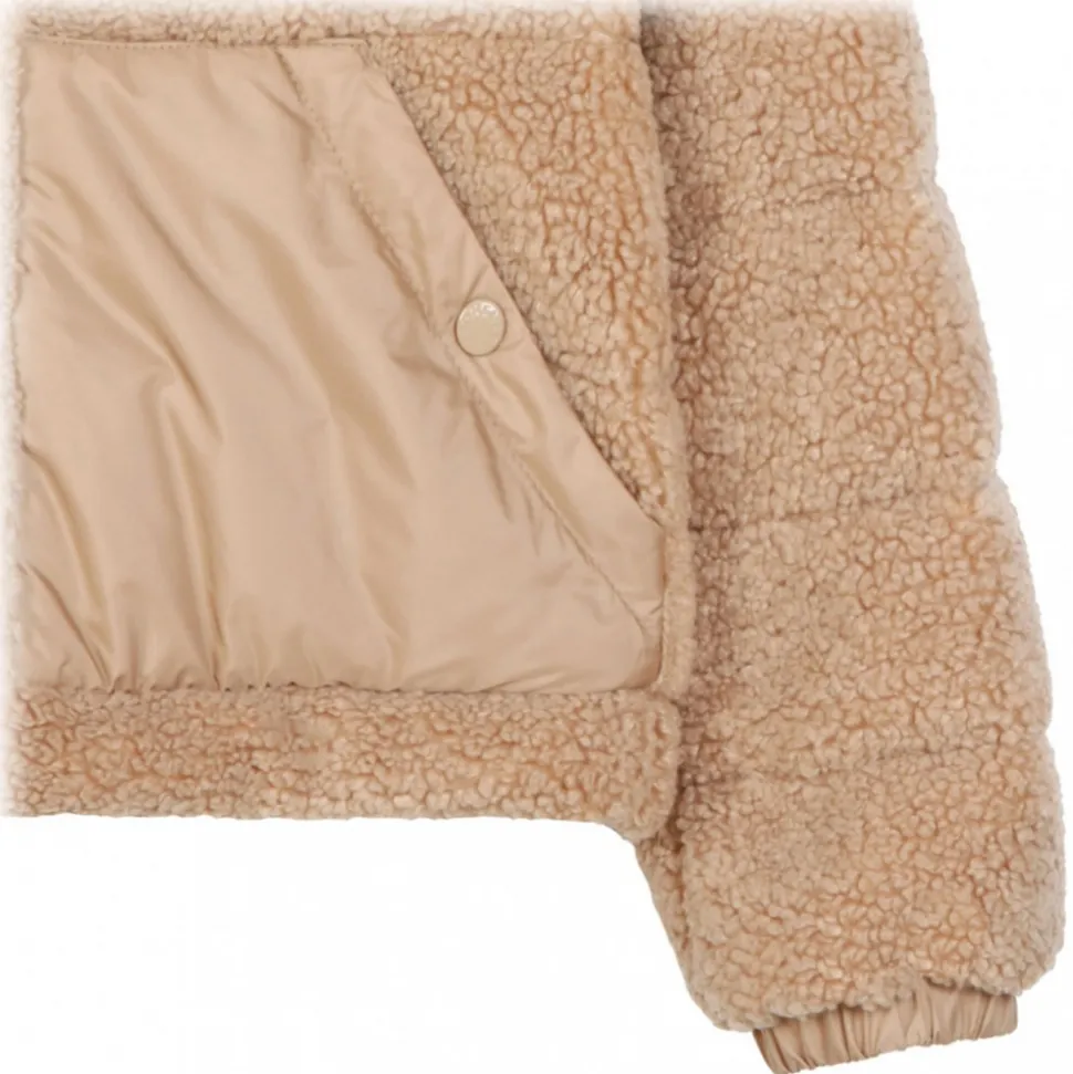 Moncler Audrieu Padded Jacket. Camel brown taupe faux shearling, feather down, padded design quilted jacket. Classic hood, long sleeves, logo patch at the sleeve, elasticated cuffs. Two press stud fastening, side pockets. Straight hem, full lining, front press stud and zip fastening.