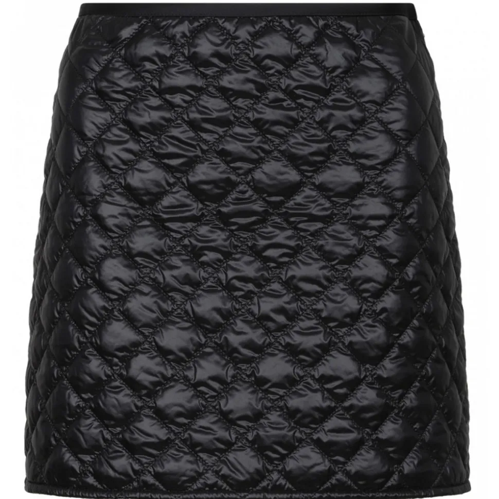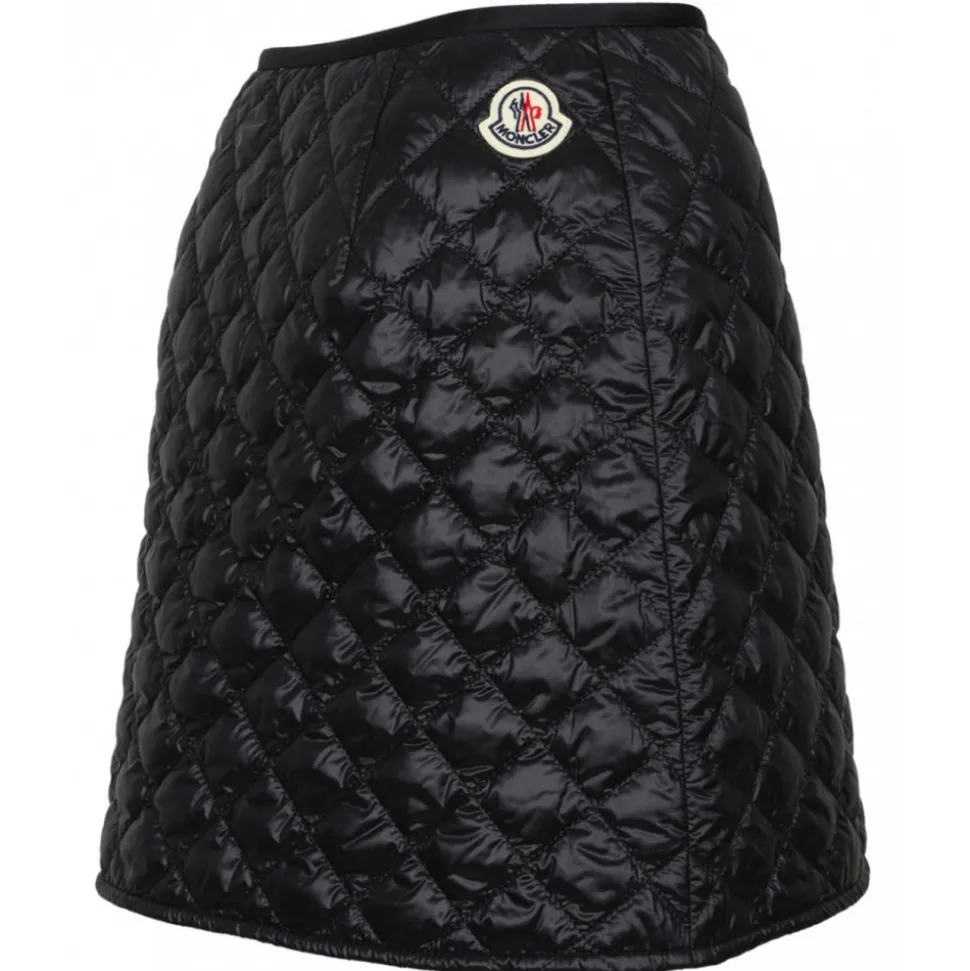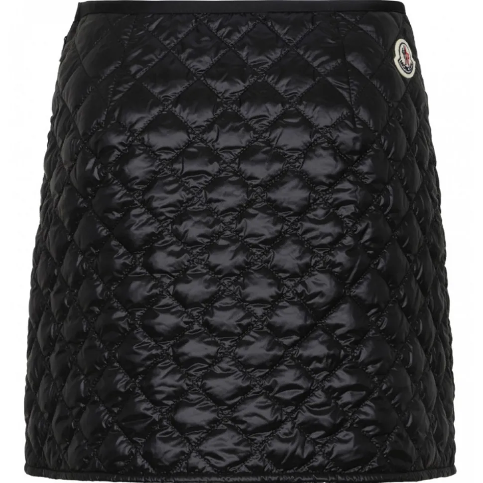 Moncler Black Padded Skirt. Black skirt made in longue saison, characterized by quilting with light padding, recalling the classic style of the 60s. Characterized by the side zip closure and the iconic felt pad applied on the back.