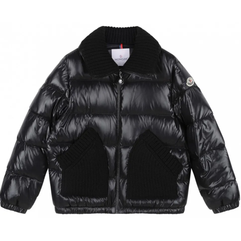 Moncler Enfant Black Puffer Jacket. Black padded design jacket, down-feather filling, quilted and metallic sheen. Knitted panels, logo patch at the sleeve, funnel neck and front zip fastening. Branded zip puller, long sleeves, elasticated cuffs, two side pouch pockets and elasticated hem.