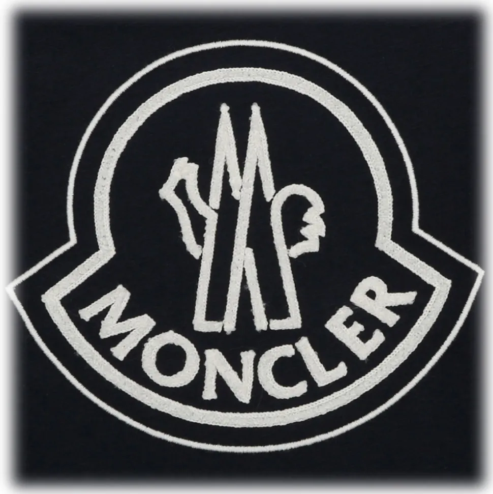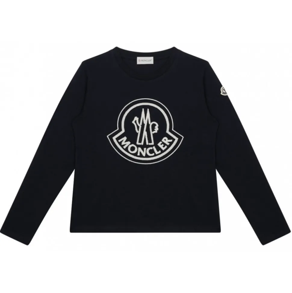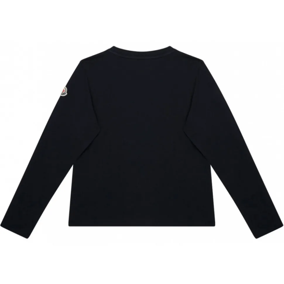 Long-sleeved Blue Cotton T-Shirt with crew neck. Front Brand logo embroidered in white. Classic Moncler Logo in the left sleeve.