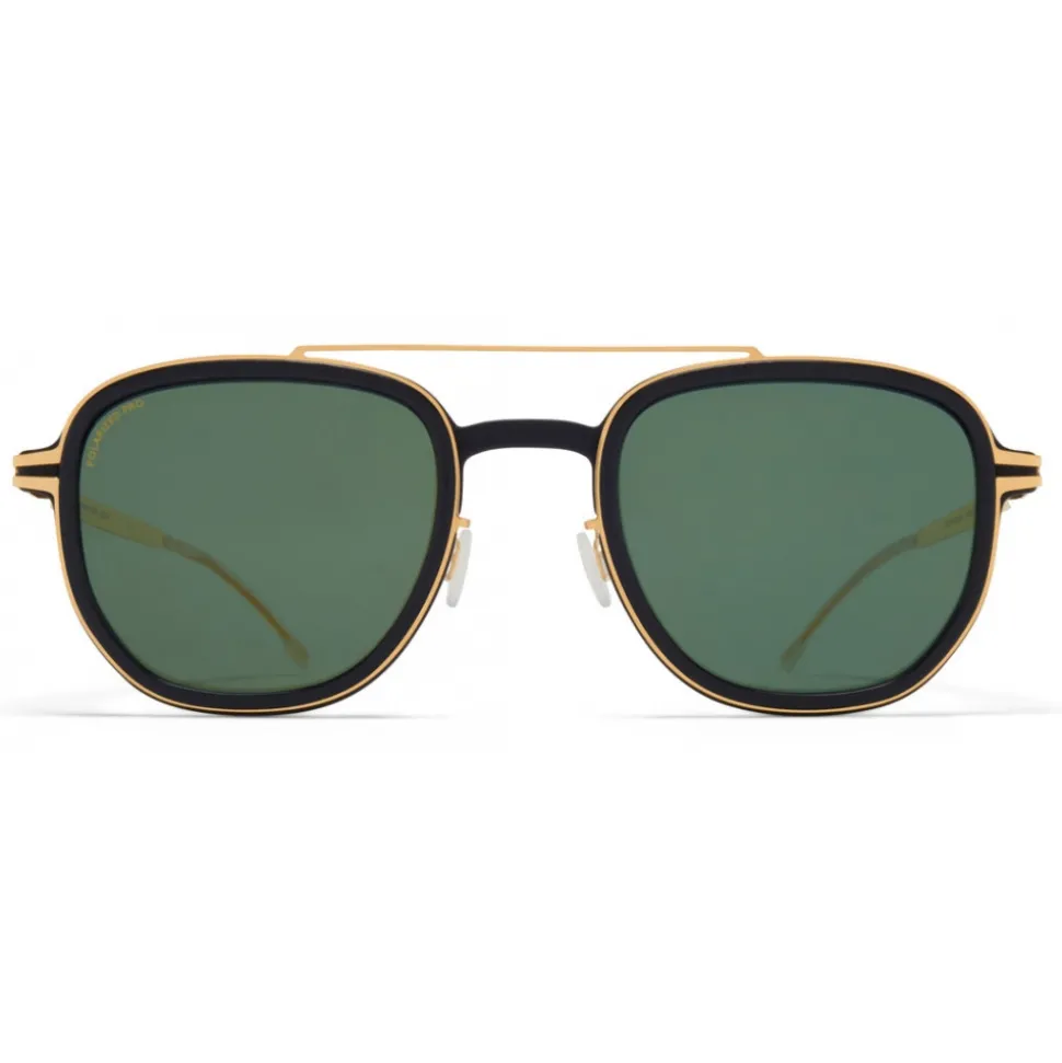 Made of lightweight stainless steel with details in MYLON, ALDER in MH7 Pitch Black/Glossy Gold with Polarised Pro Green lenses is a square-shaped sunglass frame from the MYKITA MYLON collection. Handcrafted in Berlin.
