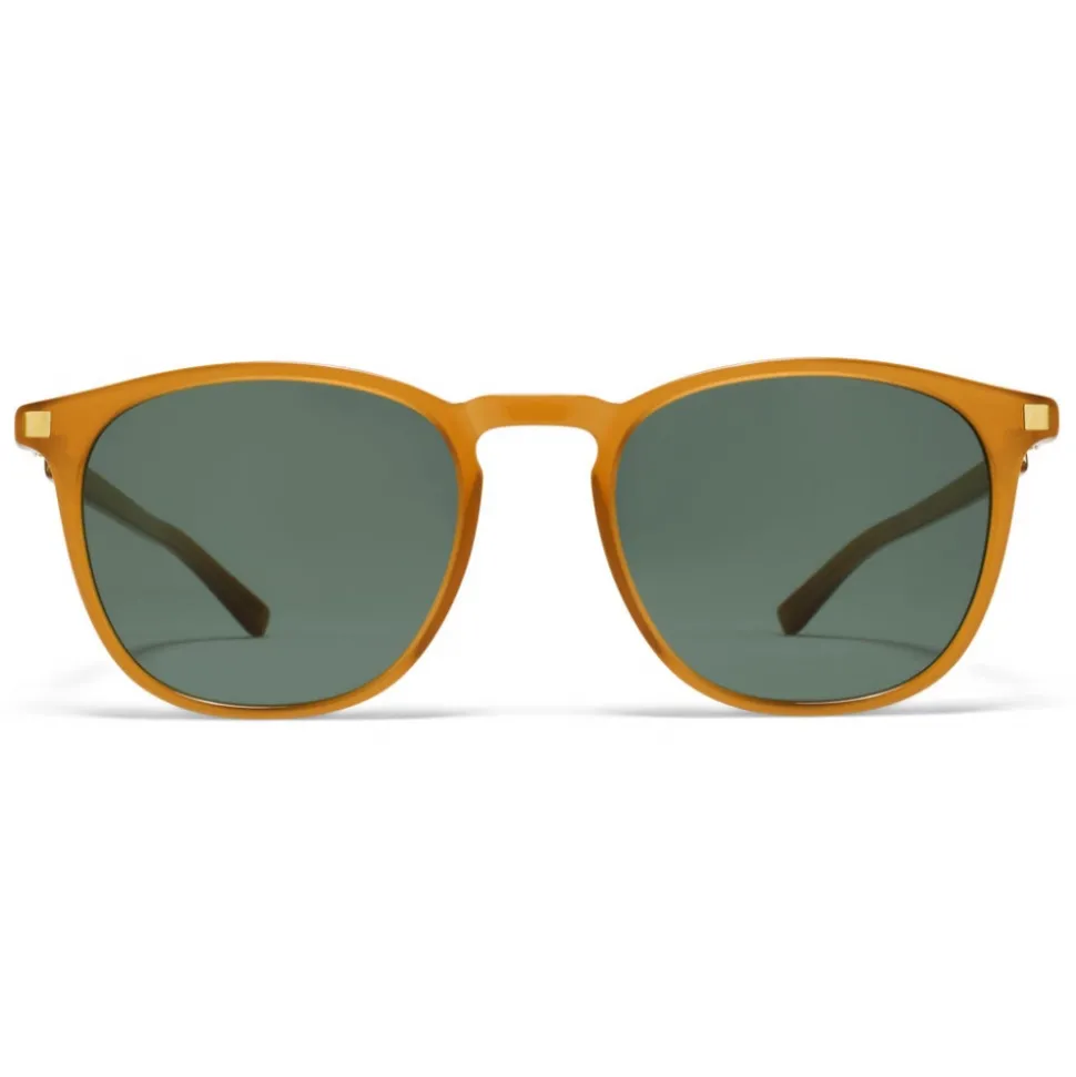 Made of lightweight stainless steel and slender acetate, ALUKI in C23 Dark Amber/Glossy Gold with Dark Green Solid lenses is a panto-shaped sunglass frame from the MYKITA LITE collection. Handcrafted in Berlin.
