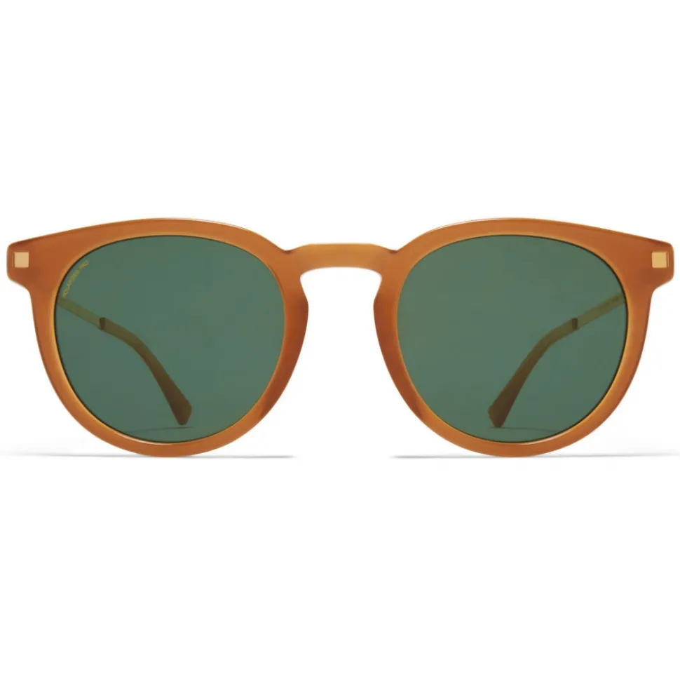 Made of lightweight stainless steel and slender acetate, LAHTI in C99 Brown/Dark Brown/Glossy Gold with Polarised Pro Green lenses is a panto-shaped sunglass frame from the MYKITA LITE ACETATE collection. Handcrafted in Berlin.