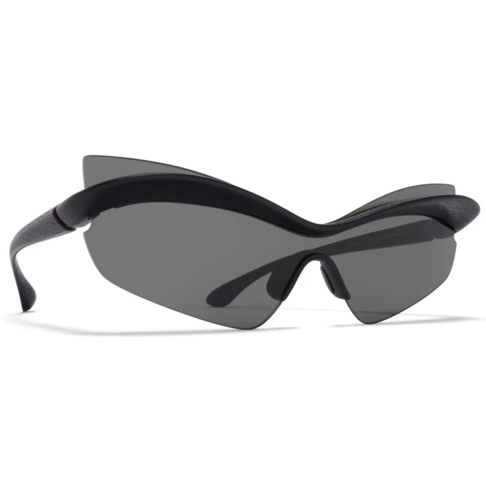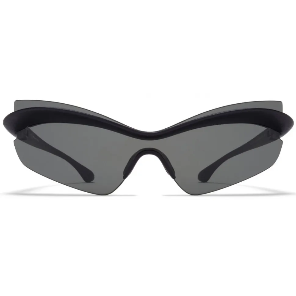 Made of lightweight stainless steel, MMECHO004 in MD1 Pitch Black with Dark Grey Solid Shield lenses is a butterfly-shaped sunglass frame from the MYKITA + MAISON MARGIELA collection. Handcrafted in Berlin.