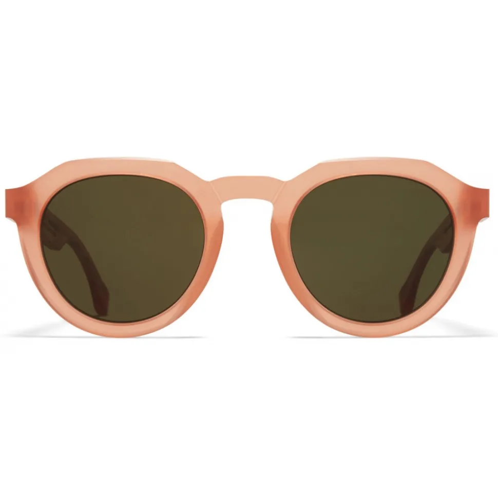 Made of unpolished acetate, MMRAW007 in Raw Misty Peach with Raw Green Solid lenses is a panto-shaped sunglass frame from the MYKITA + MAISON MARGIELA collection. The visible traces of the milling process make each model unique. Handcrafted in Berlin.