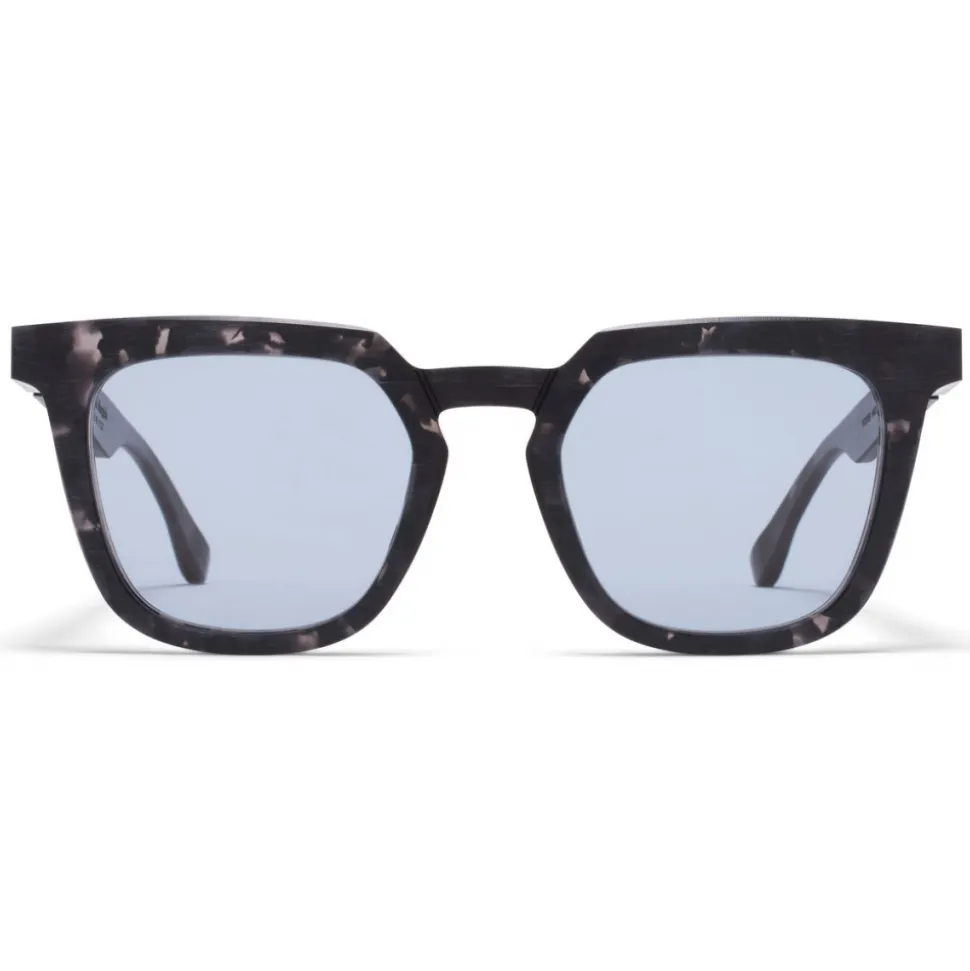 Made of unpolished acetate, MMRAW008 in Raw Black Havana with Sky Blue Solid lenses is a square-shaped sunglass frame from the MYKITA + MAISON MARGIELA collection. The visible traces of the milling process make each model unique. Handcrafted in Berlin.