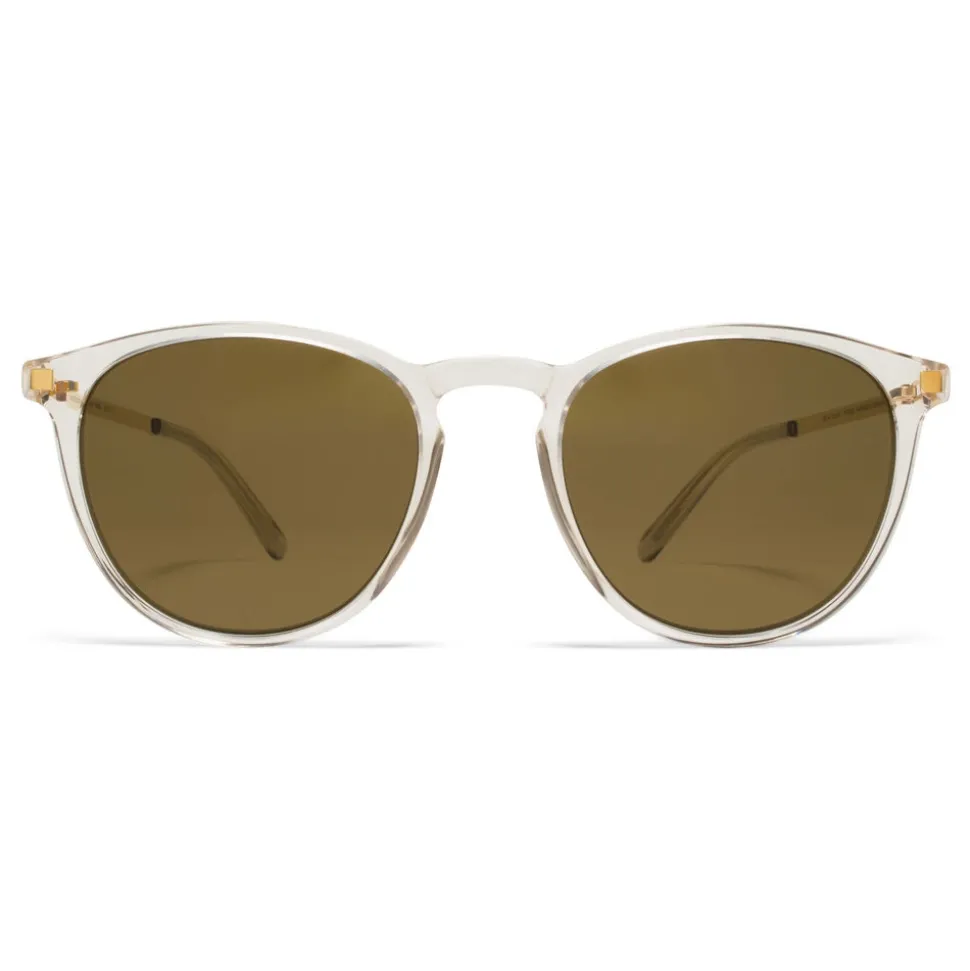 Made of lightweight stainless steel and slender acetate, NUKKA in Champagne/Glossy Gold with Raw Brown Solid lenses is a panto-shaped sunglass frame from the MYKITA LITE collection. Handcrafted in Berlin.