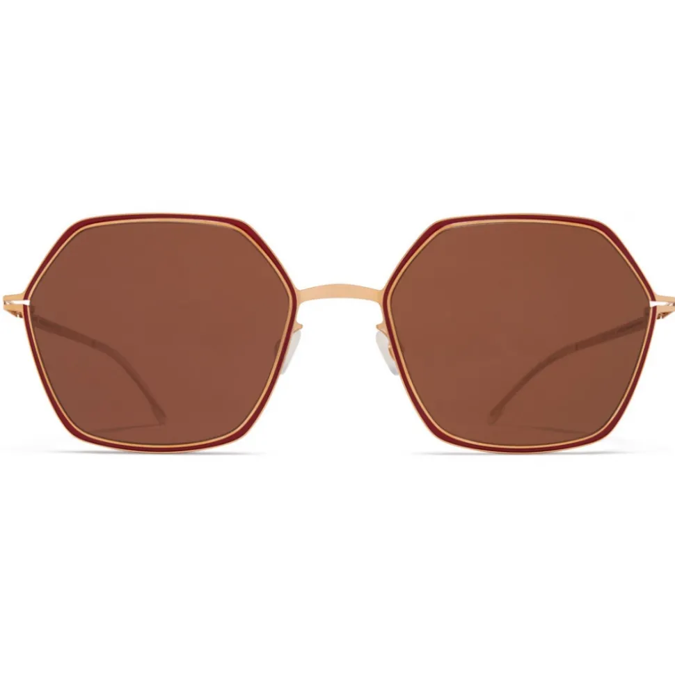 Made of lightweight stainless steel, TILLA in Champagne Gold/Cranberry with Brown Solid lenses is a square-shaped sunglass frame from the MYKITA DECADES collection with a geometric rim design. Handcrafted in Berlin.