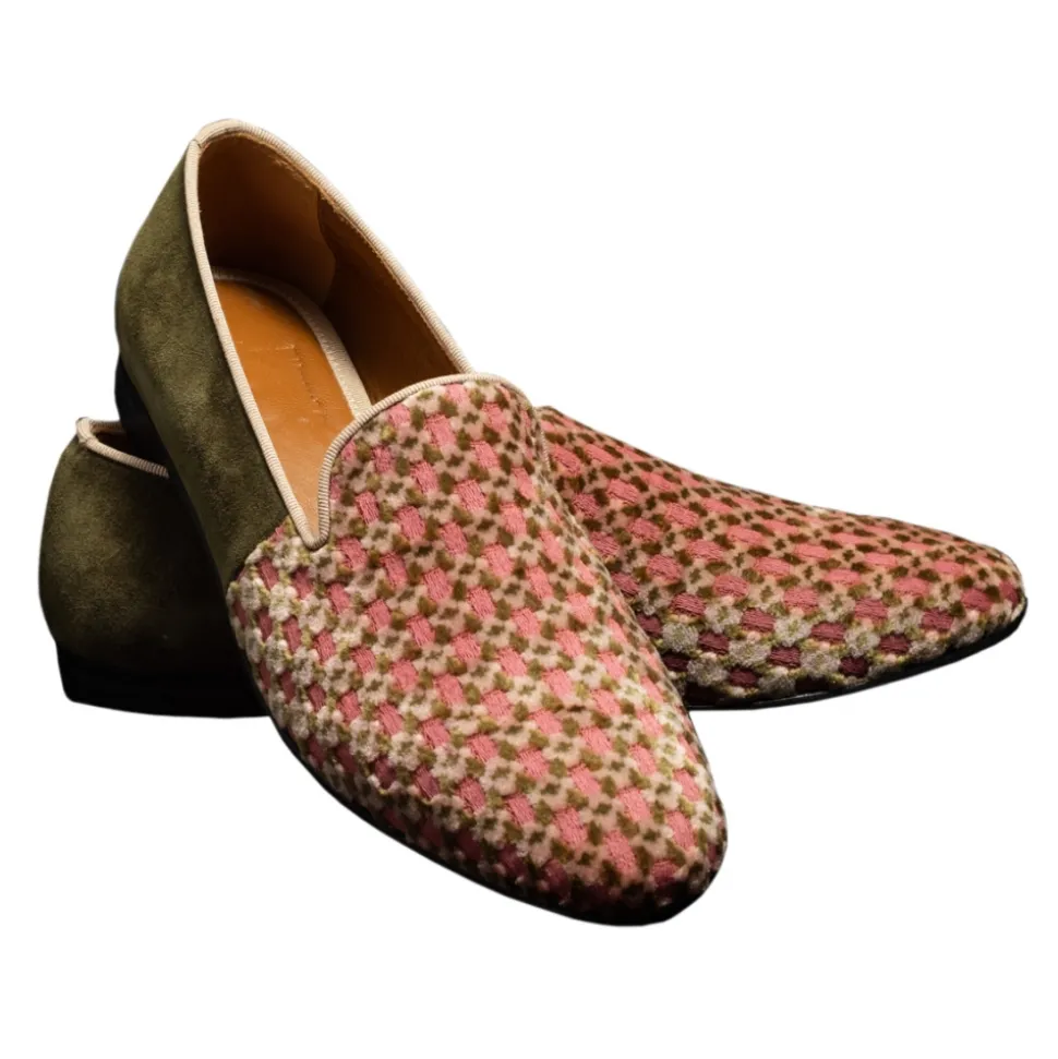 Men’s shoe made entirely by hand in shaved silk velvet with pink background in evidence, forming moss green and beige diamond pattern.