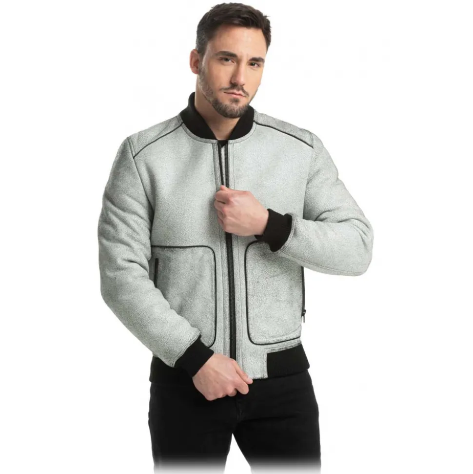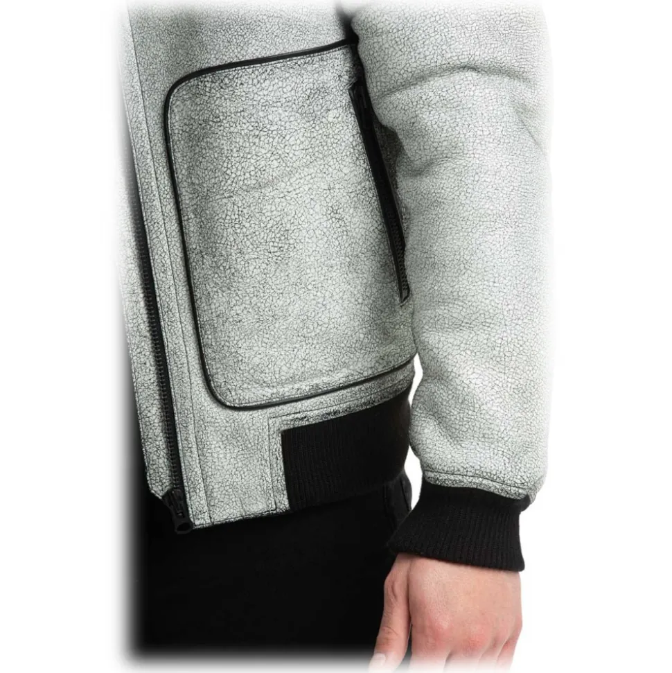 The Melza is a white cracked leather bomber jacket on a black background to give contrast and relief to the whole. the leather is worked by hand to give it this cracked appearance in volume and since it is handmade the rendering is unique to each piece. the interior is made of merino wool for a feeling of softness and comfort while retaining body heat thanks to the thermoregulatory properties of wool.