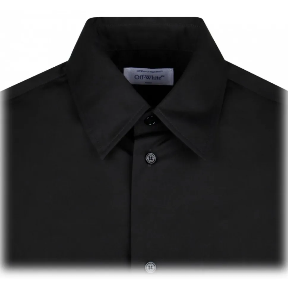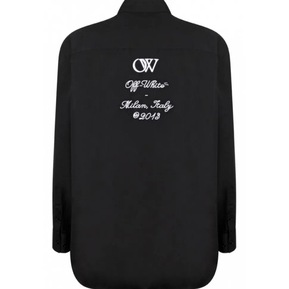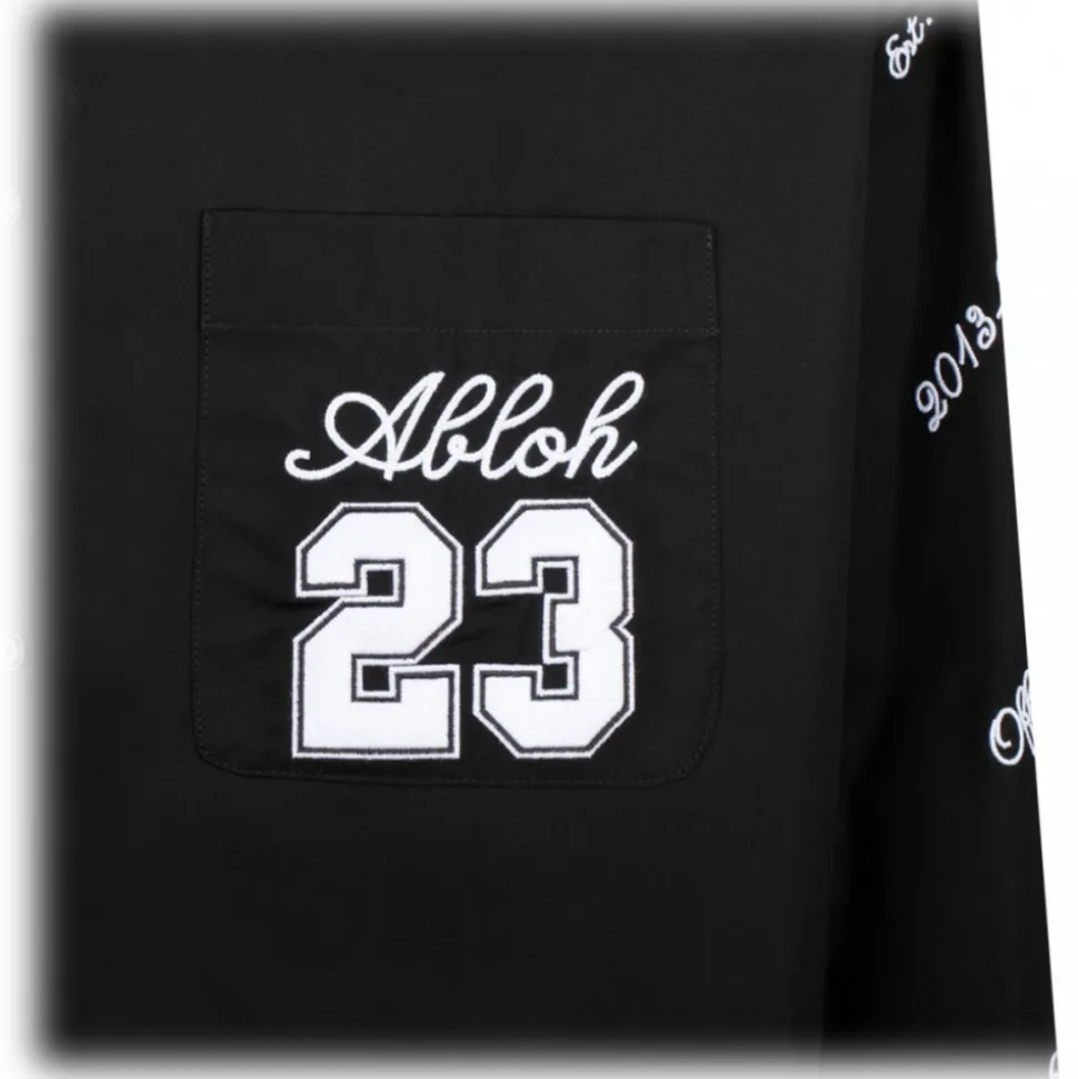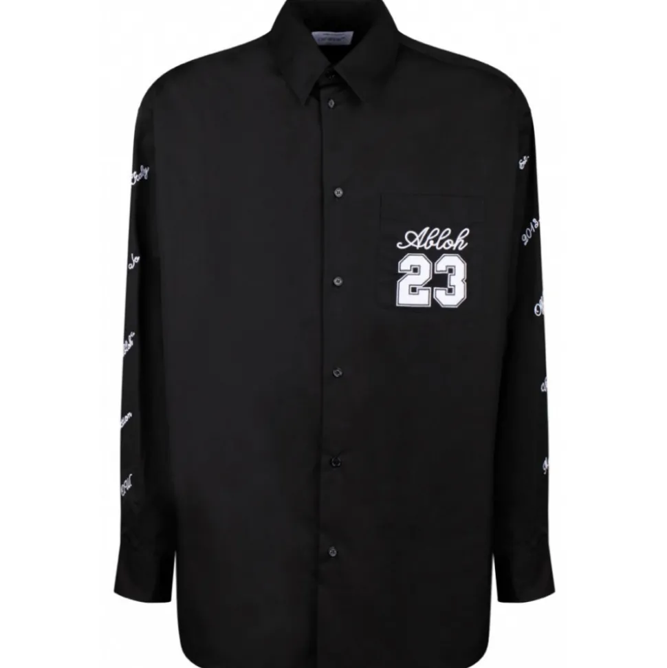 Off White 23 Heavycoat Overshirt. Black cotton overshirt, poplin texture, embroidered logo to the front, sleeves and rear. Pointed flat collar, front button fastening, drop shoulder, long sleeves, buttoned cuffs. Chest patch pocket, curved hem.