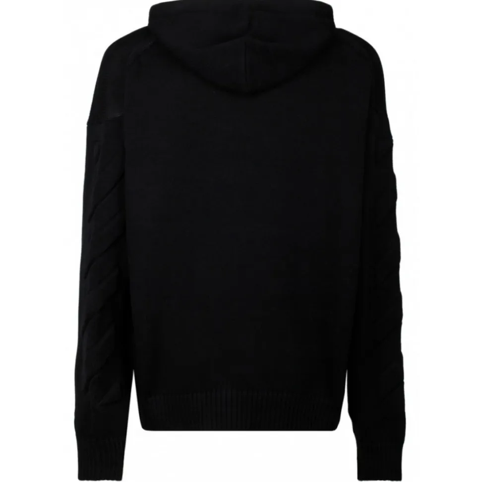 Off White Black 3D Diag Knit Hoodie. Black knit hoodie with 3D tonal diagonal details on the sleeves. 3D tonal arrow ad diagonal details at back. Hooded, long sleeves.