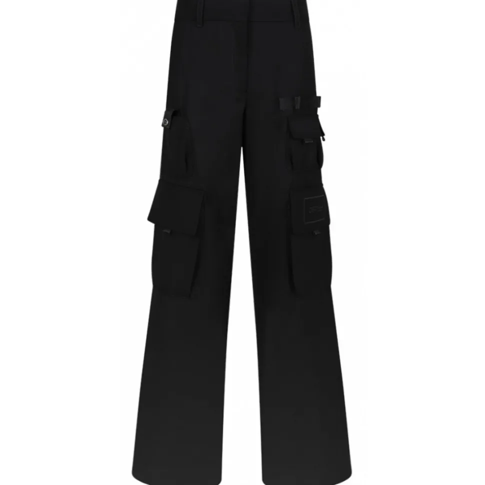 Off White Black Wo Gab Toybox Cargo Trousers. Black virgin wool cargo trousers, logo patch to the front, tape detailing. Mid rise, belt loops, concealed front fastening, two side slit pockets. Multiple cargo pockets, two rear welt pockets, straight leg.