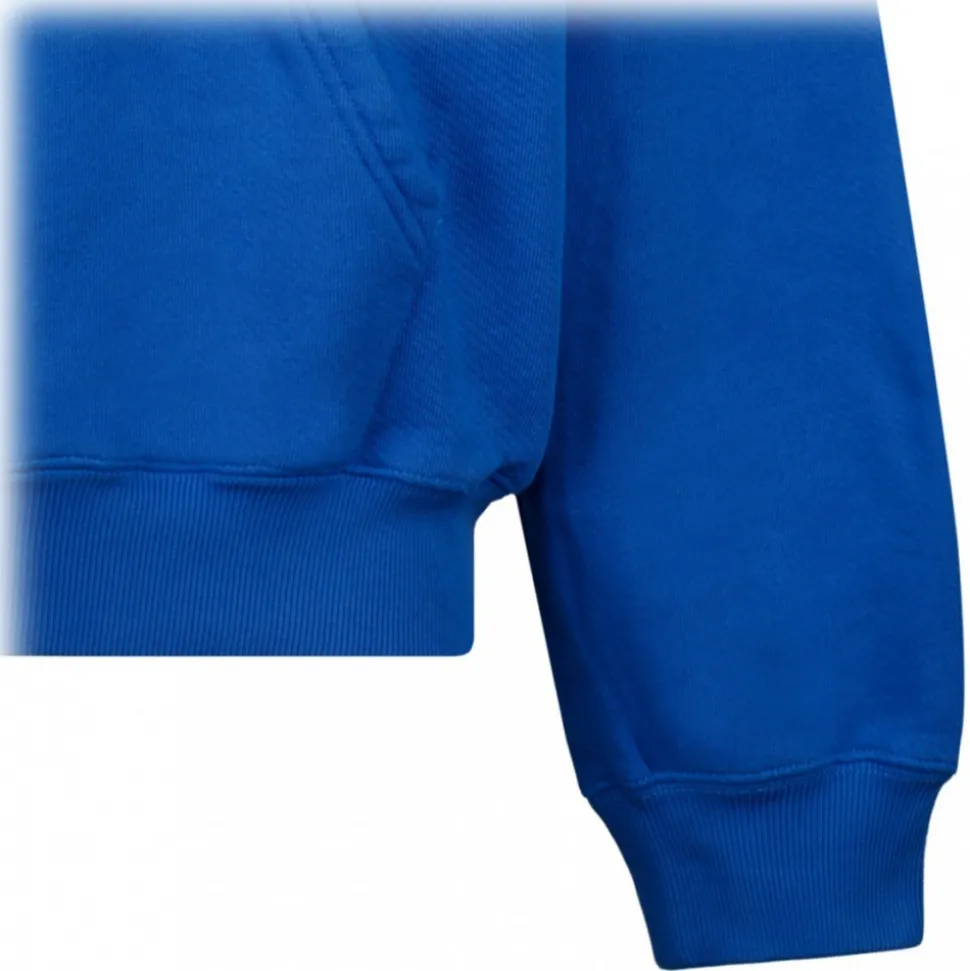 Off White Football Print Hoodie. Blue cotton hoodie, drawstring hood, logo print to the front, drop shoulder, long sleeves. Front pouch pocket, logo print at the sleeve, numerical print at rear, ribbed trim, straight hem.