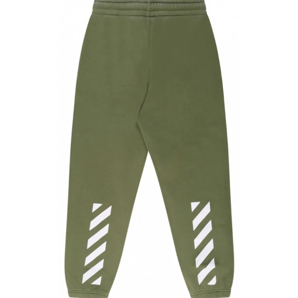 Off White Kids Military Green and White Cotton Bookish Track Pants. Military green and white cotton track pants, logo print to the front, drawstring fastening waist, two side slit pockets, elasticated ankles, straight leg.