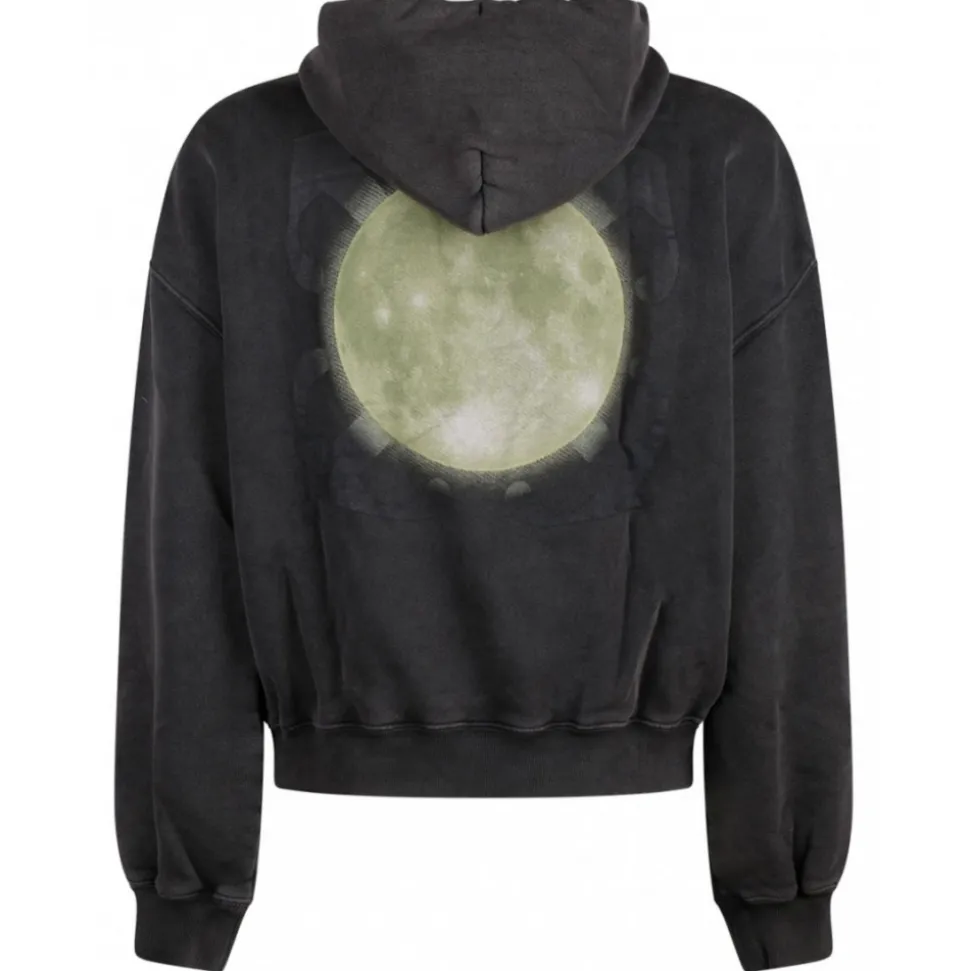 Off White Smoky Black and Neon Green Cotton Super Moon Hoodie. smoky black and neon green cotton hoodie, drawstring hood, front pouch pocket, drop shoulder, graphic print to the rear, long sleeves, ribbed cuffs and hem, straight hem.