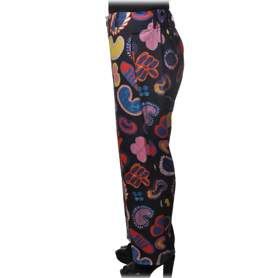 Ottod’Ame trousers, model with elastic waistband and wide leg, with strap and zip closure, in multicolor abstract pattern.