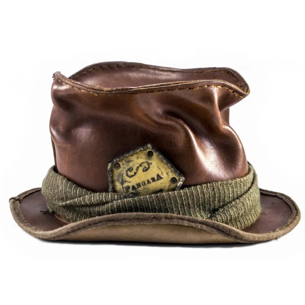Cylindrical hair in leather, sewn by hand and molded to water. interior lined with striped patterns.