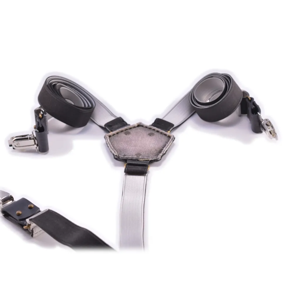 Restyle of the Pangae modelA leather suspenders, this new design for men or women is characterized by the leather pentagon gusset used as a junction for the crossing of the elastic bands.