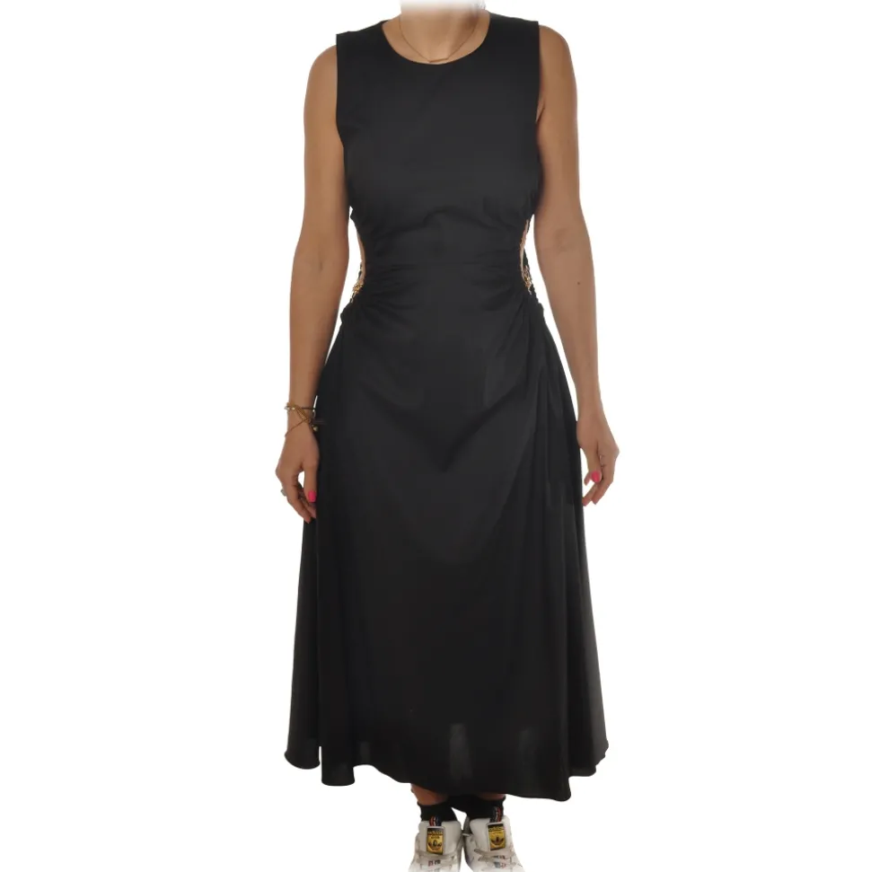 Patrizia Pepe dress, long model, sleeveless, with wide skirt, cut at the waist with two side portholes finished with gold chain, with zip closure on the back.