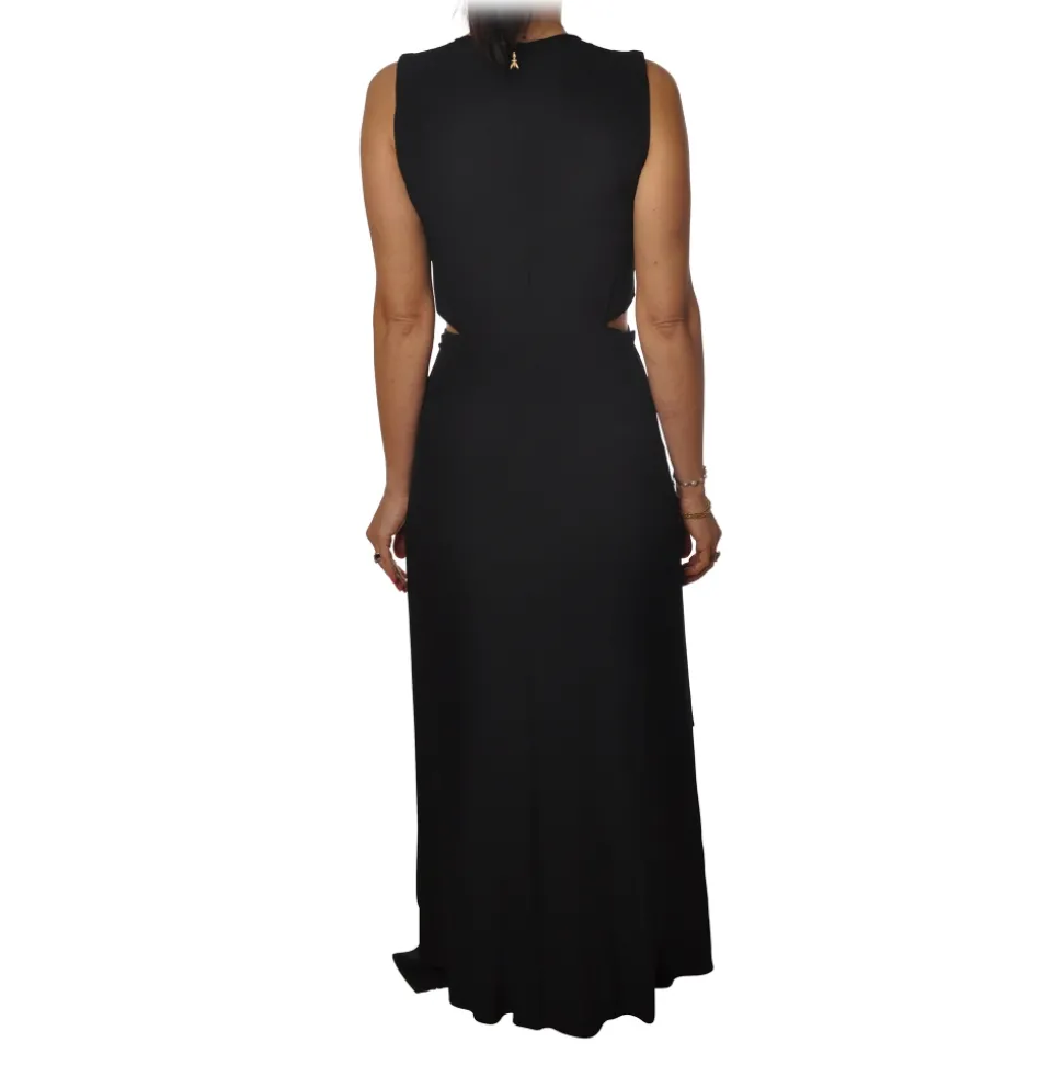 Patrizia Pepe dress, long model with V-neck, sleeveless, with cut at the waist, porthole detail on the sides, in light cady fabric, zip closure on the back.