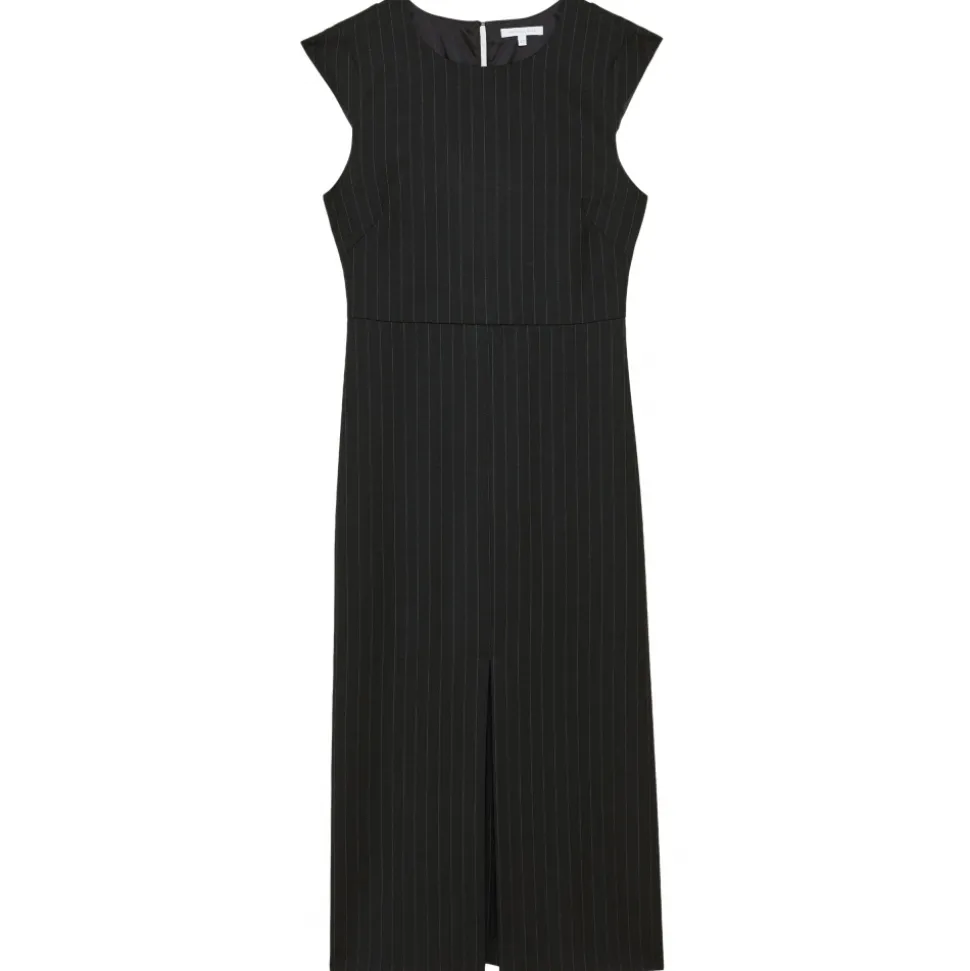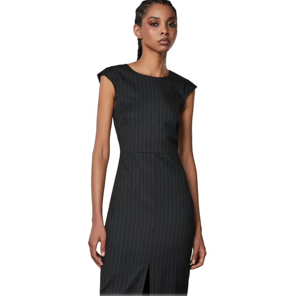 Patrizia Pepe sheath dress with sleeveless even neckline, cut at waist and midi length with central slit, in combed and pinstripe fabric.