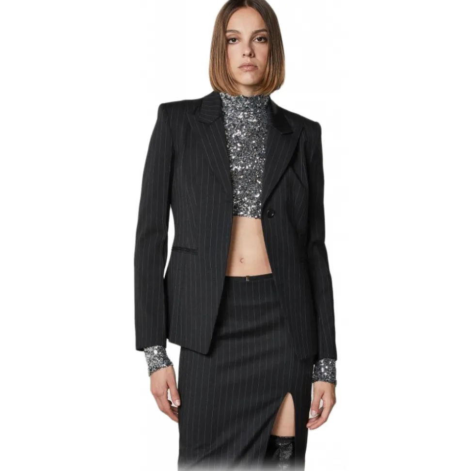 Patrizia Pepe jacket, single breasted model with one button fastening, high lapels, two concealed welt pockets, in a pinstripe pattern, with metallic detail on the back.
