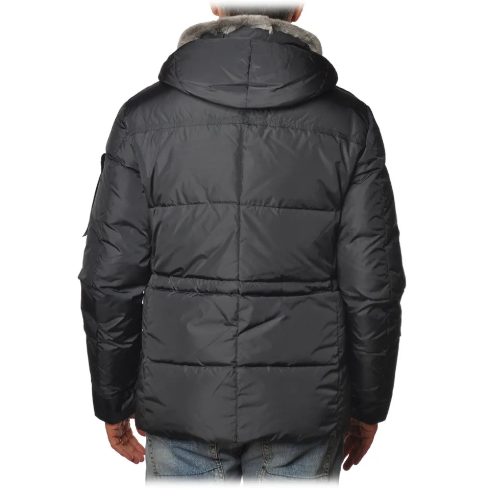 Peuterey jacket, Aiptek model, four-pocket model with drawstring inside, in shiny fabric, with fixed hood and removable real fur collar, feather padding.