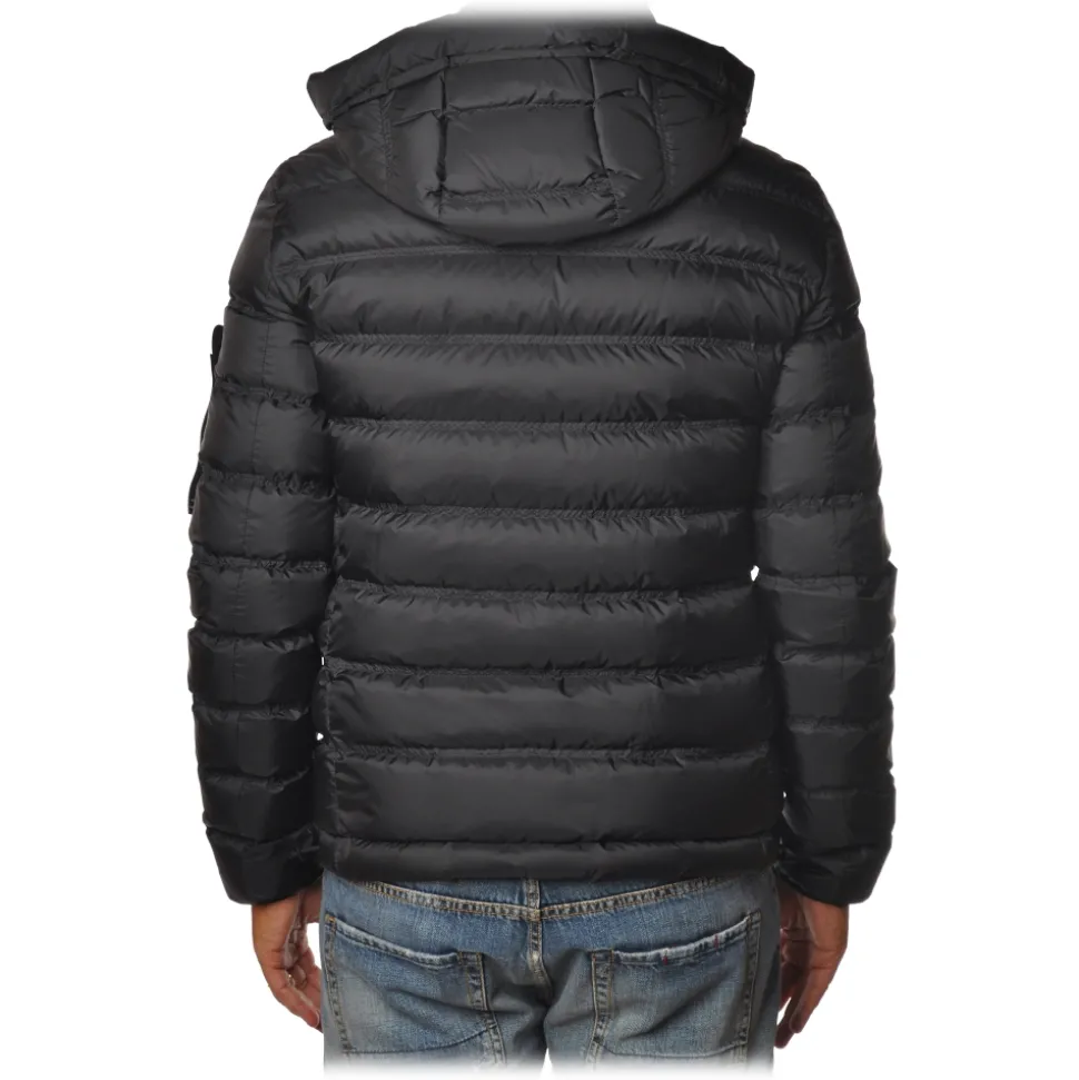 Peuterey jacket, Boggs model, short model with standing collar profiled by logo, and fixed hood, horizontal stitched fabric, with two oblique pockets with zip, central zip closure, goose down padding.
