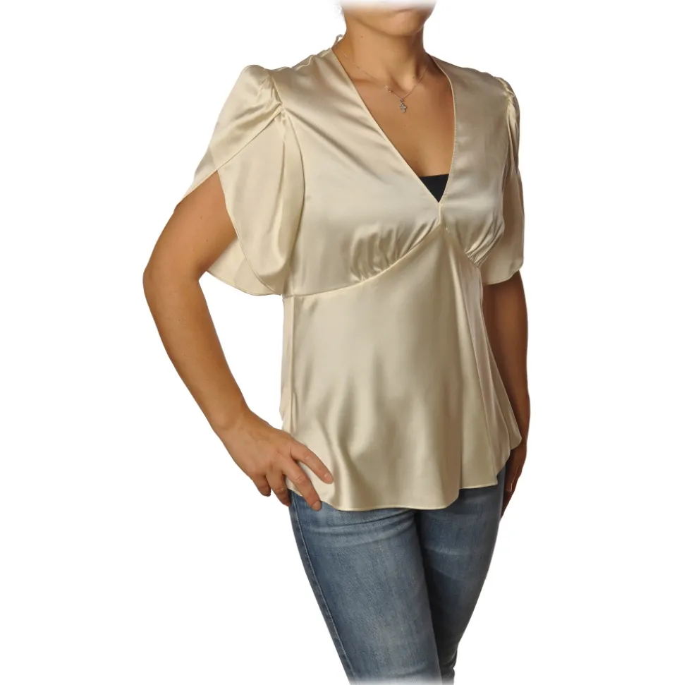 V-neck blouse shirt with tulip-shaped half sleeves, entirely made of shiny silk, Pinko.