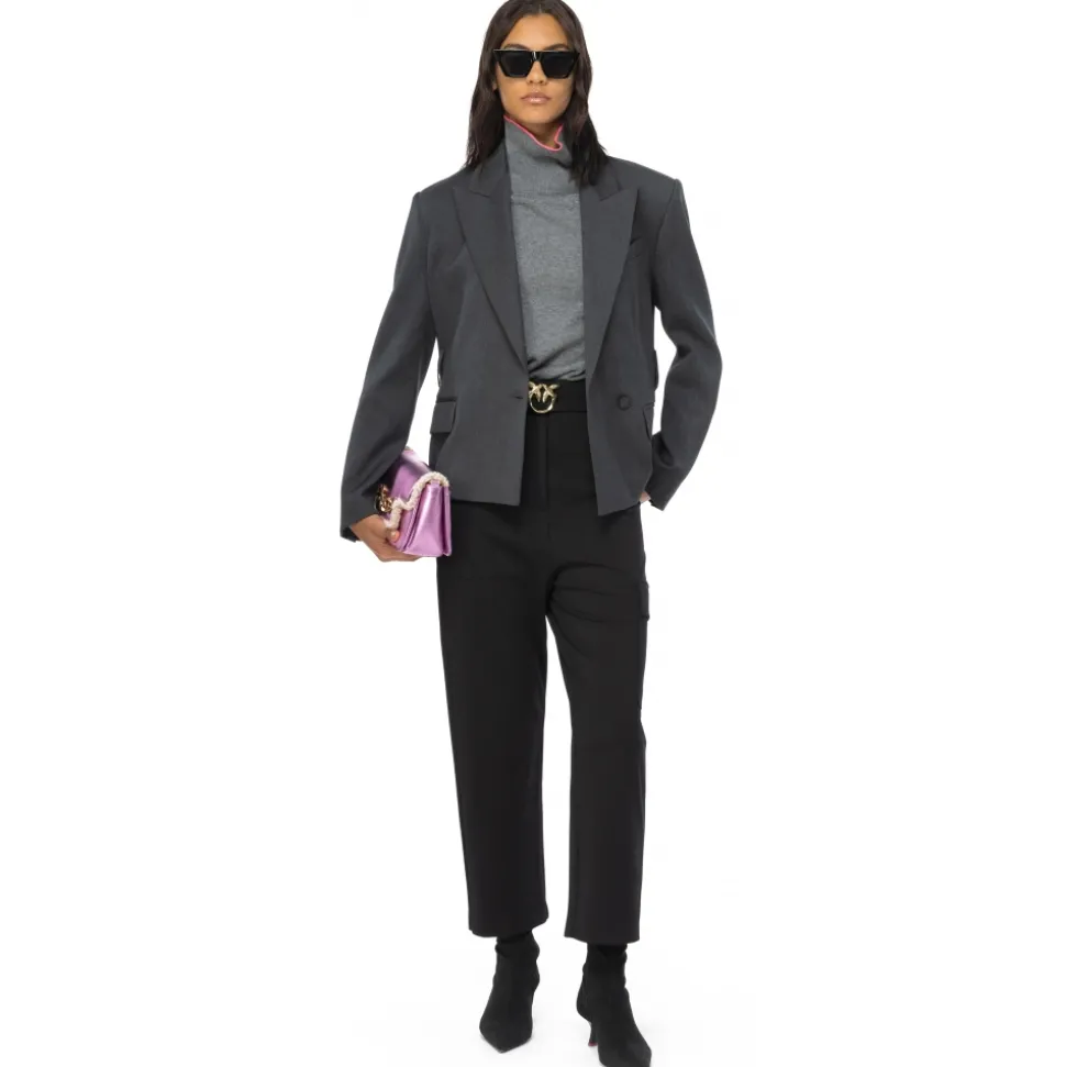Pinko cargo trousers in technical stretch viscose fabric worked in fabric stitch. High waist with belt loops and matching belt in the same fabric with Love Birds Diamond Cut buckle, inset pockets on the hips and patch pockets on the back. Straight leg. Zip and small hook fastening.