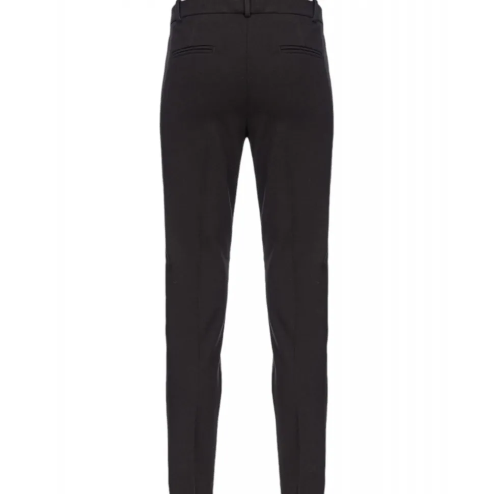 Pinko cigarette-fit trousers in technical stretch viscose fabric, worked in fabric stitch. Regular waist with belt loops, French pockets on the front and welt pockets on the back, refined ironed pleat detail on the centre leg. Zip and small hook fastening.
