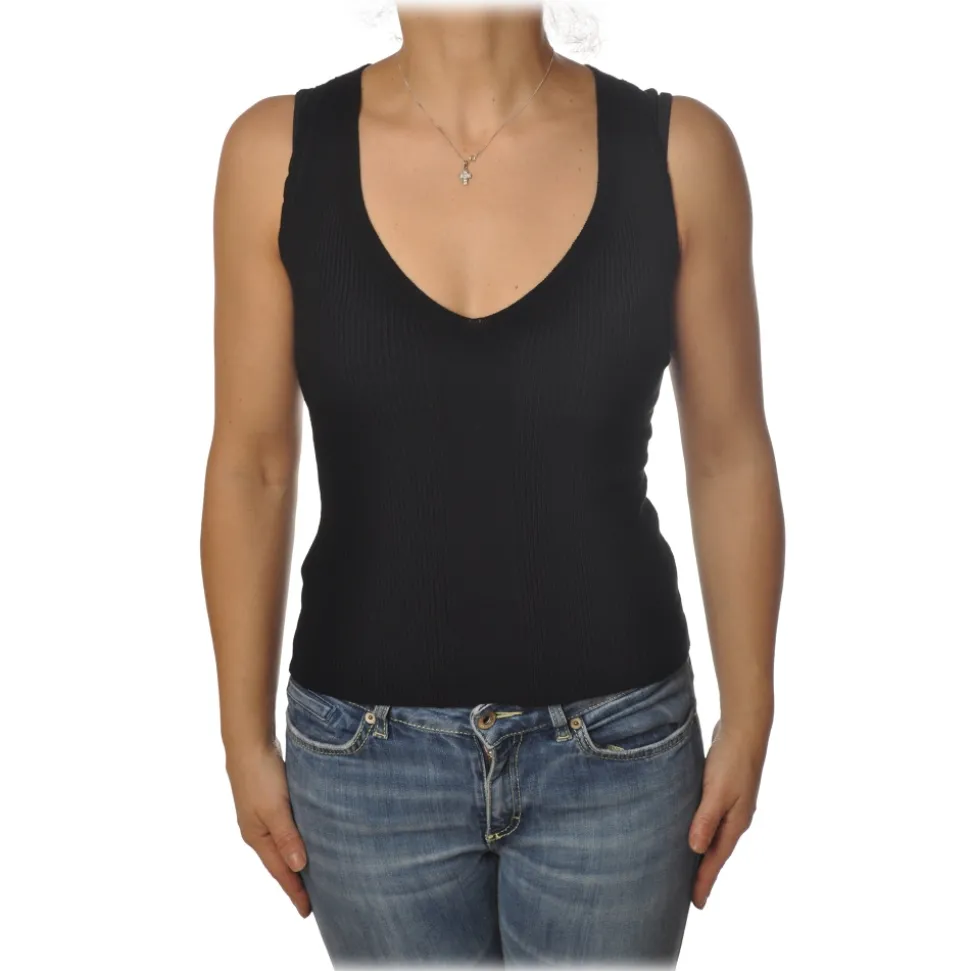 Wide shoulder tank top, V-neck, slim fit, ribbed, lace back, Pinko.