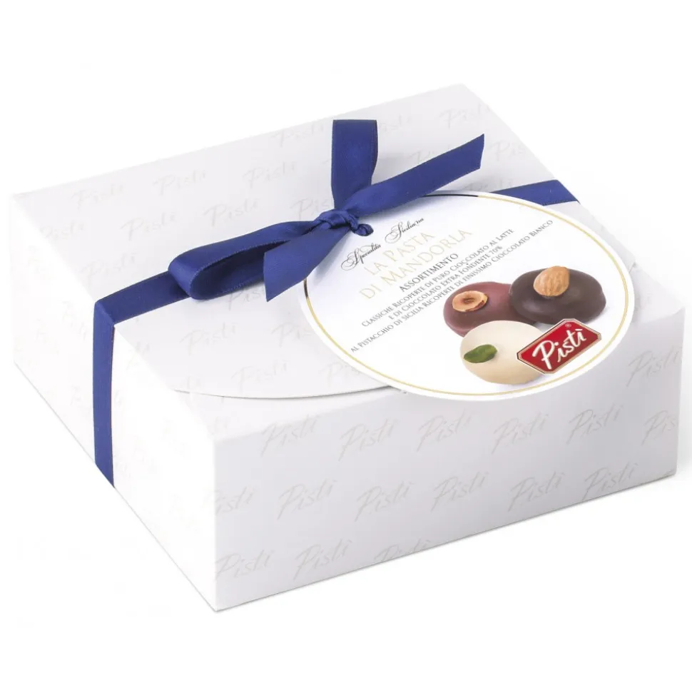 Almond paste enclosed in elegant gift boxes with bow. Proposed in three assortments made up of coated, classic or mono-flavored pastries flavored with Sicilian pistachio.