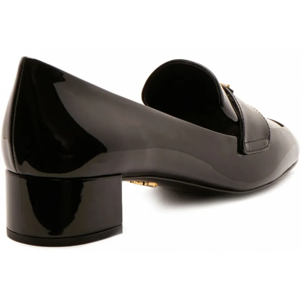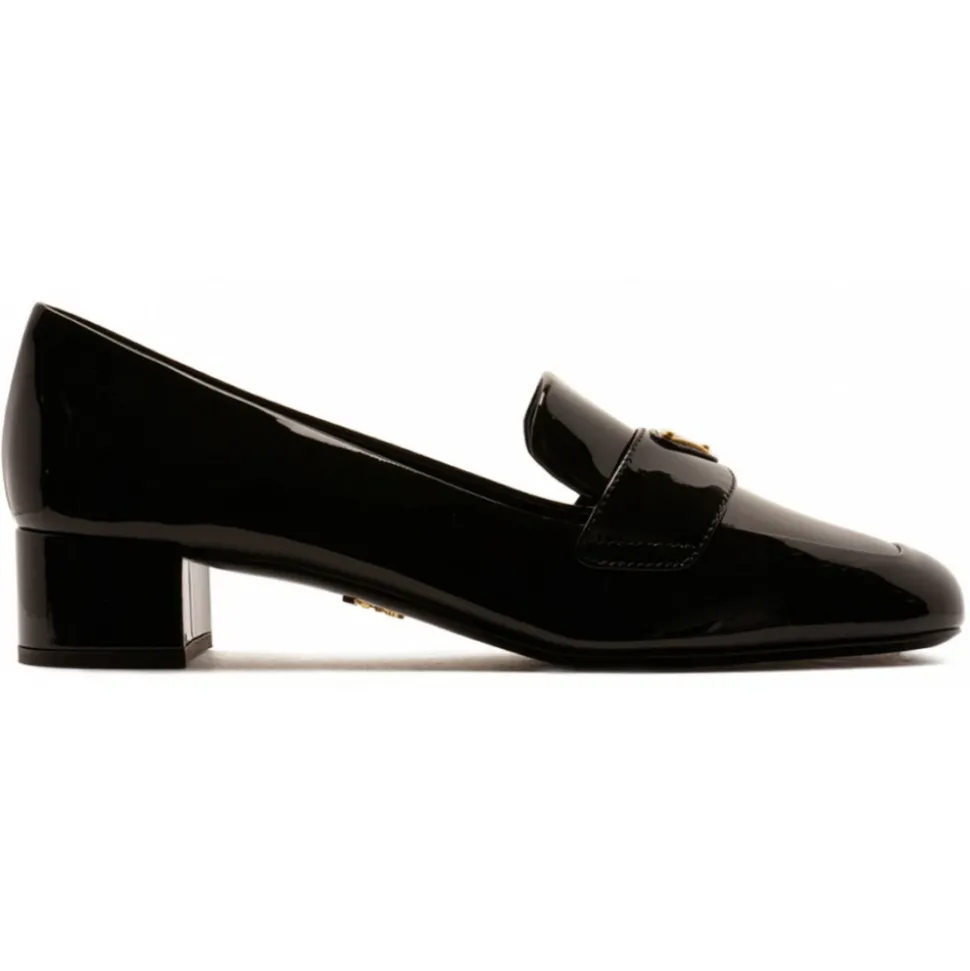 Prada Black Pumps. Black calfskin pumps, glossy finish, square toe. Enamel triangle with logo, leather insole with logo, 35mm block heel. Color logo plaque on the sole, leather sole and slip-on design.