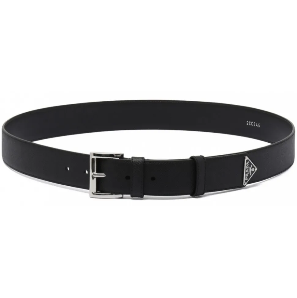 Prada Black Triangle Logo Belt. Black Saffiano leather belt, buckle fastening, enamel triangle logo, punched holes and adjustable fit.