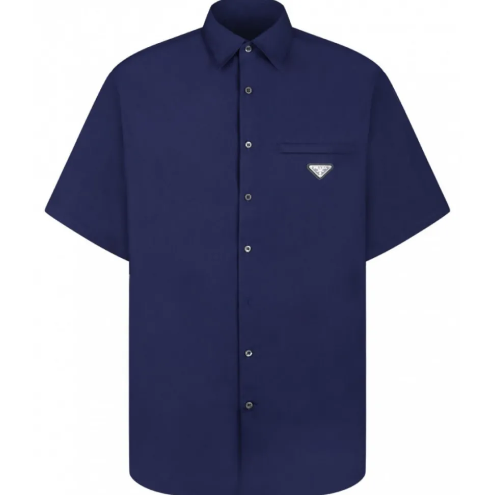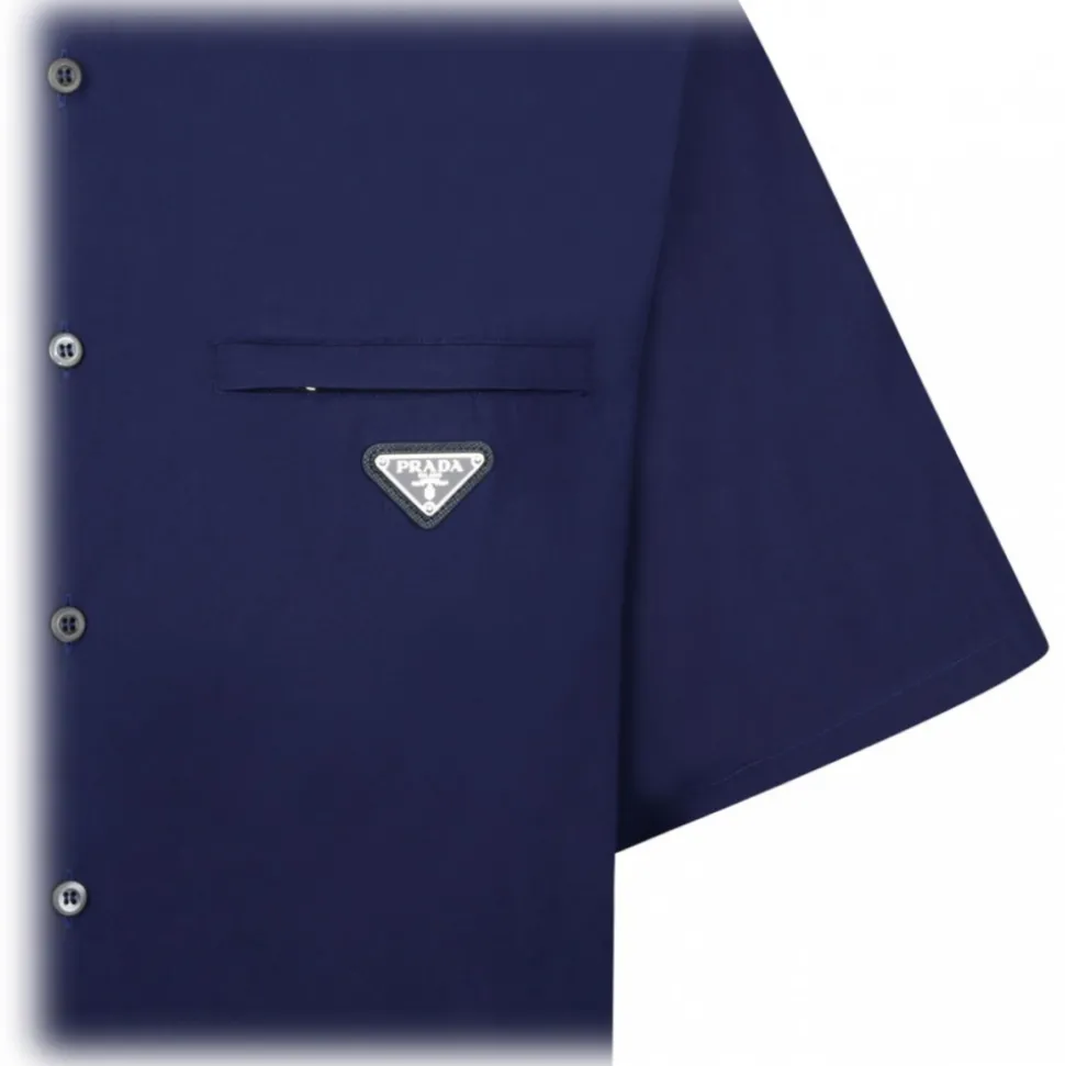 Prada Blue Poplin Shirt. Blue poplin shirt, classic collar, button closure, chest pocket, triangle logo in enamelled metal.