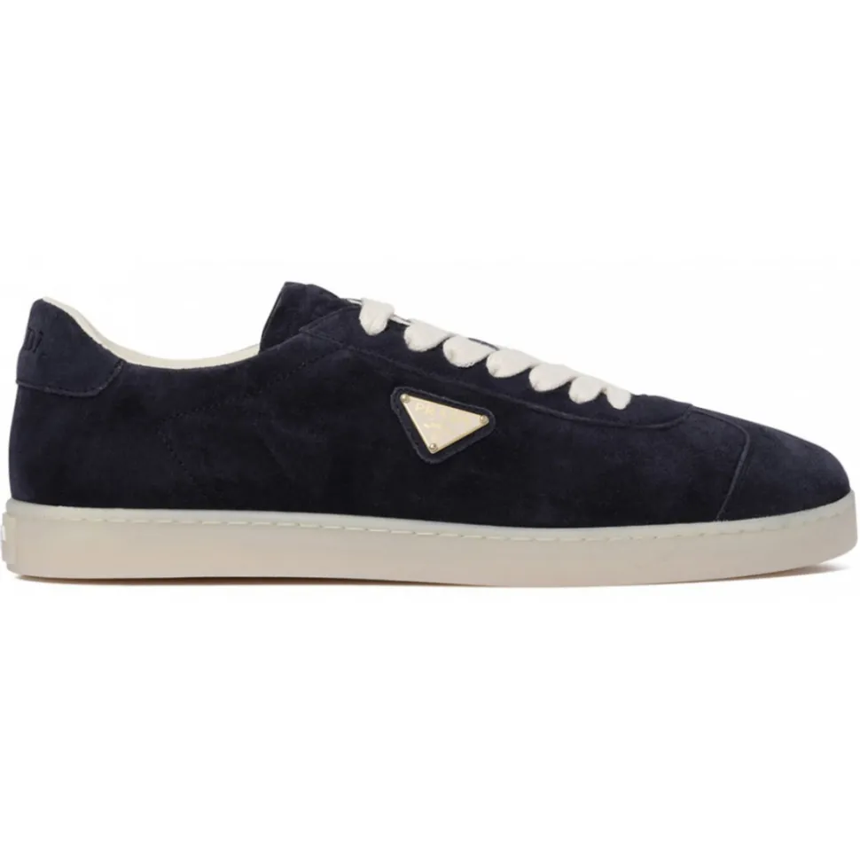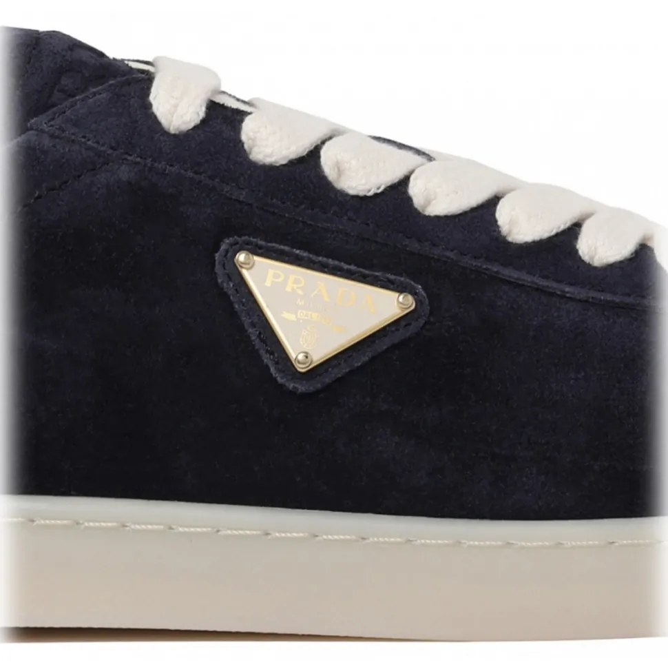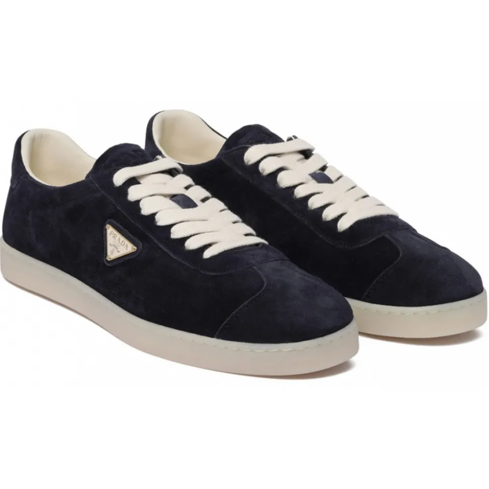 Prada Midnight Blue Lane Sneakers. Midnight blue suede sneakers, enamel triangle logo, logo-debossed tongue, branded heel counter. Logo at the sole, round toe, front lace-up fastening, removable insole, rubber sole.