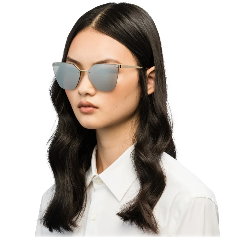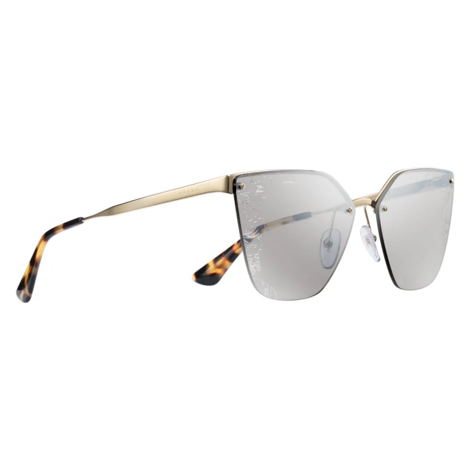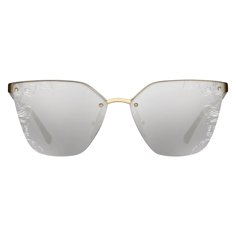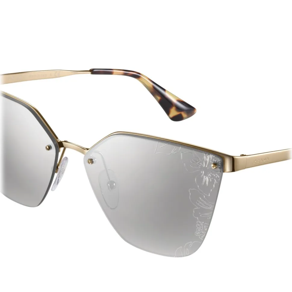 Sun model with an irregular and distinctive design. Rimless and ultra-flat lenses with iconic Ibiscus design applied directly to the metal superstructure of the front. Cinéma auctions with Prada logo engraved lettering.