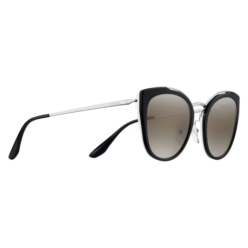 Female model with a broad, gently rounded silhouette made of acetate. The front is illuminated by a distinctive polished metal insert that enhances the sophisticated design. Prada Logo Lettering engraved.