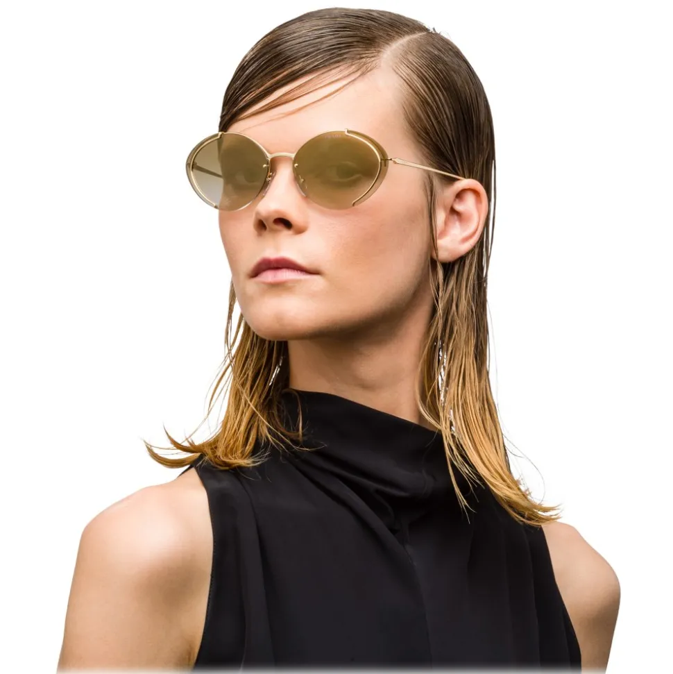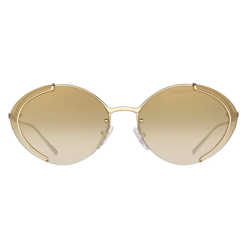 Oval silhouette with minimalist and sophisticated appeal. Rimless and flat lenses with elegant profiles in polished metal that lend design. Ultrathin rods with Prada logo engraved lettering.