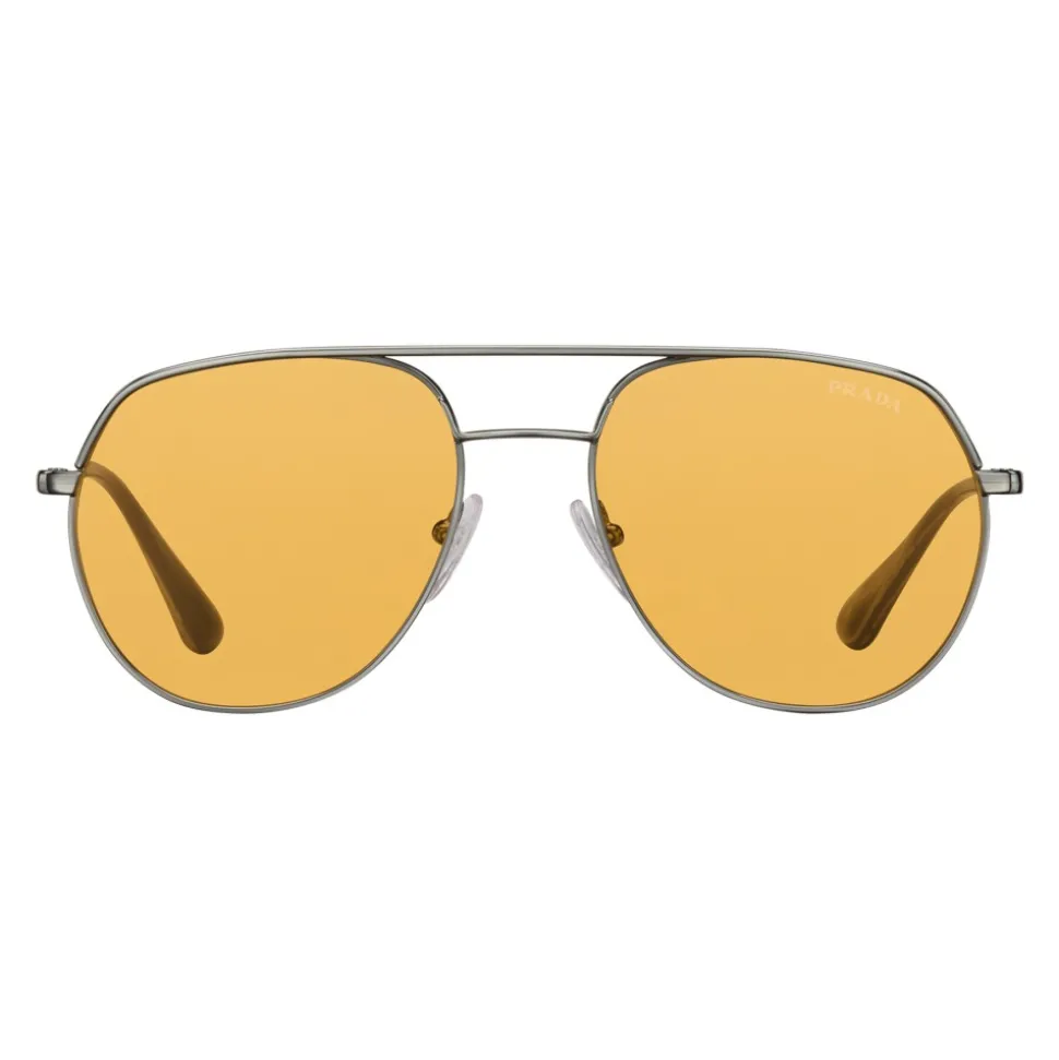 Masculine model with a sophisticated and elegant design. Front with pilot silhouette drawn by thin metal profiles. Double linear and decisive bridge. Ultra-thin rods with flat plate and engraved Prada Lettering logo.