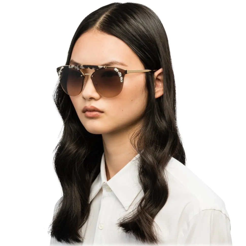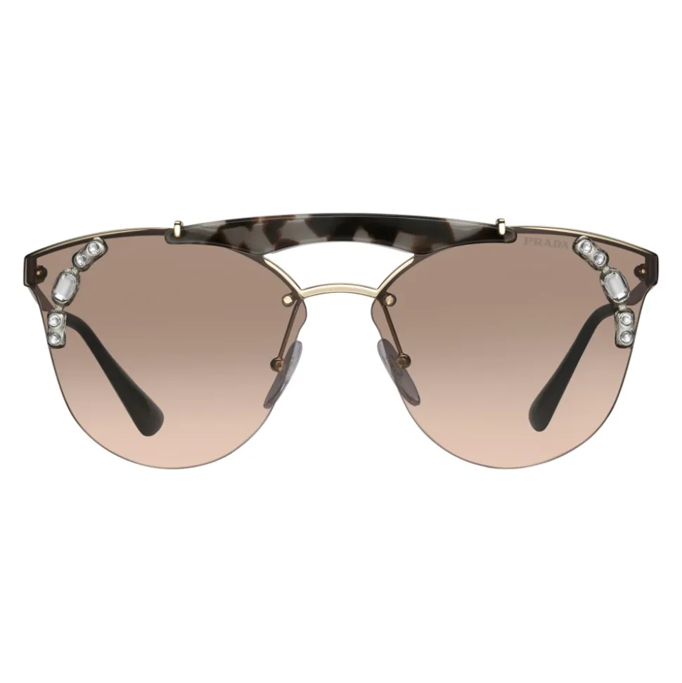Elegant cat silhouette made of metal. Flat rimless lenses enriched by distinctive applications with visible details and an acetate top bar. Metal bars with engraved Prada Lettering logo.